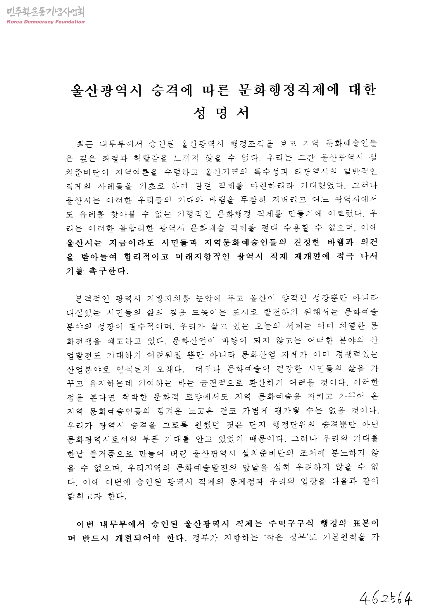 울산광역시 승격에 따른 문화행정직제에 대한 성명서
