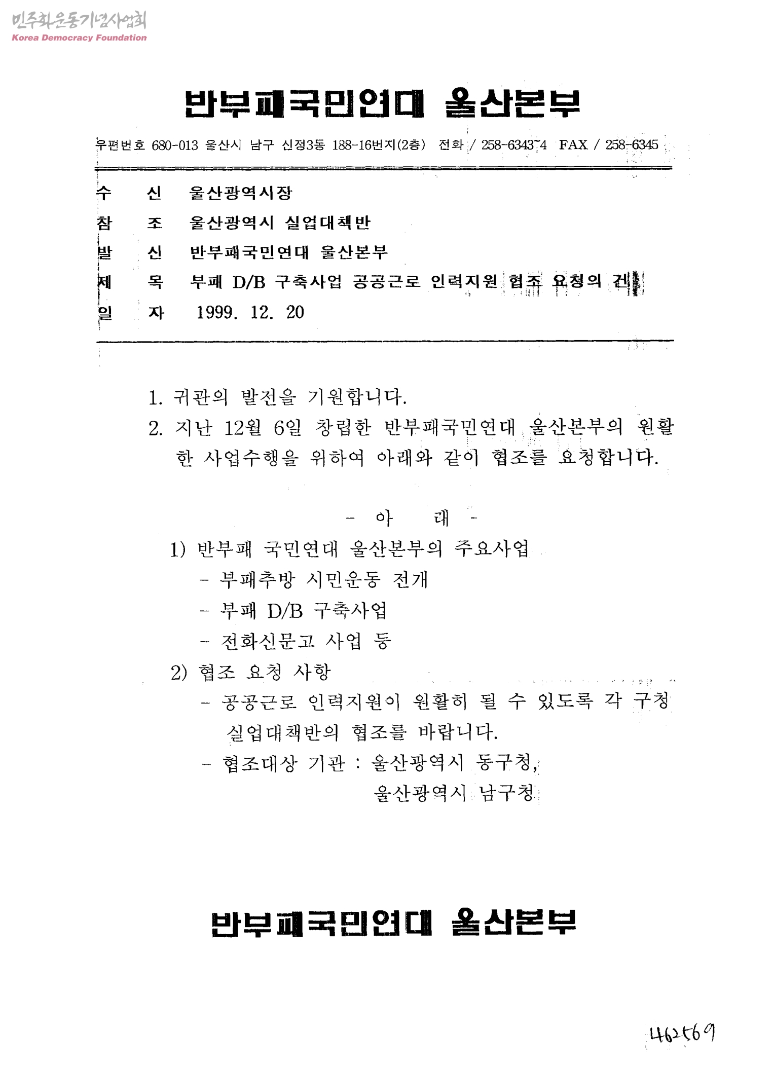 부패 D/B 구축사업 공공근로 인력지원 협조 요청의 건[수신: 울산광역시장, 발신: 반부패국민연대 울산본부]