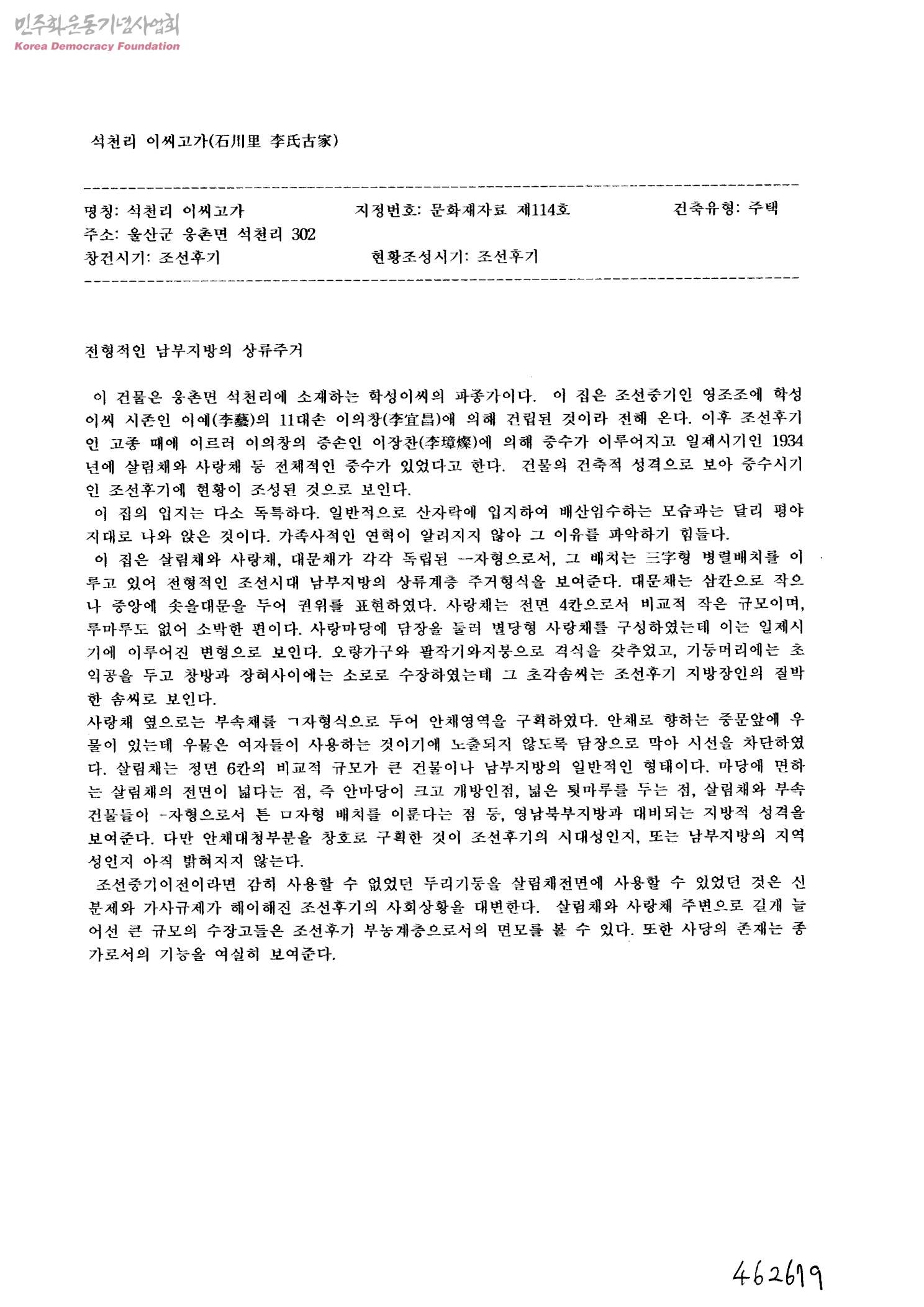 석천리 이씨고가(石川里 李氏古家)-전형적인 남부지방의 상류주거