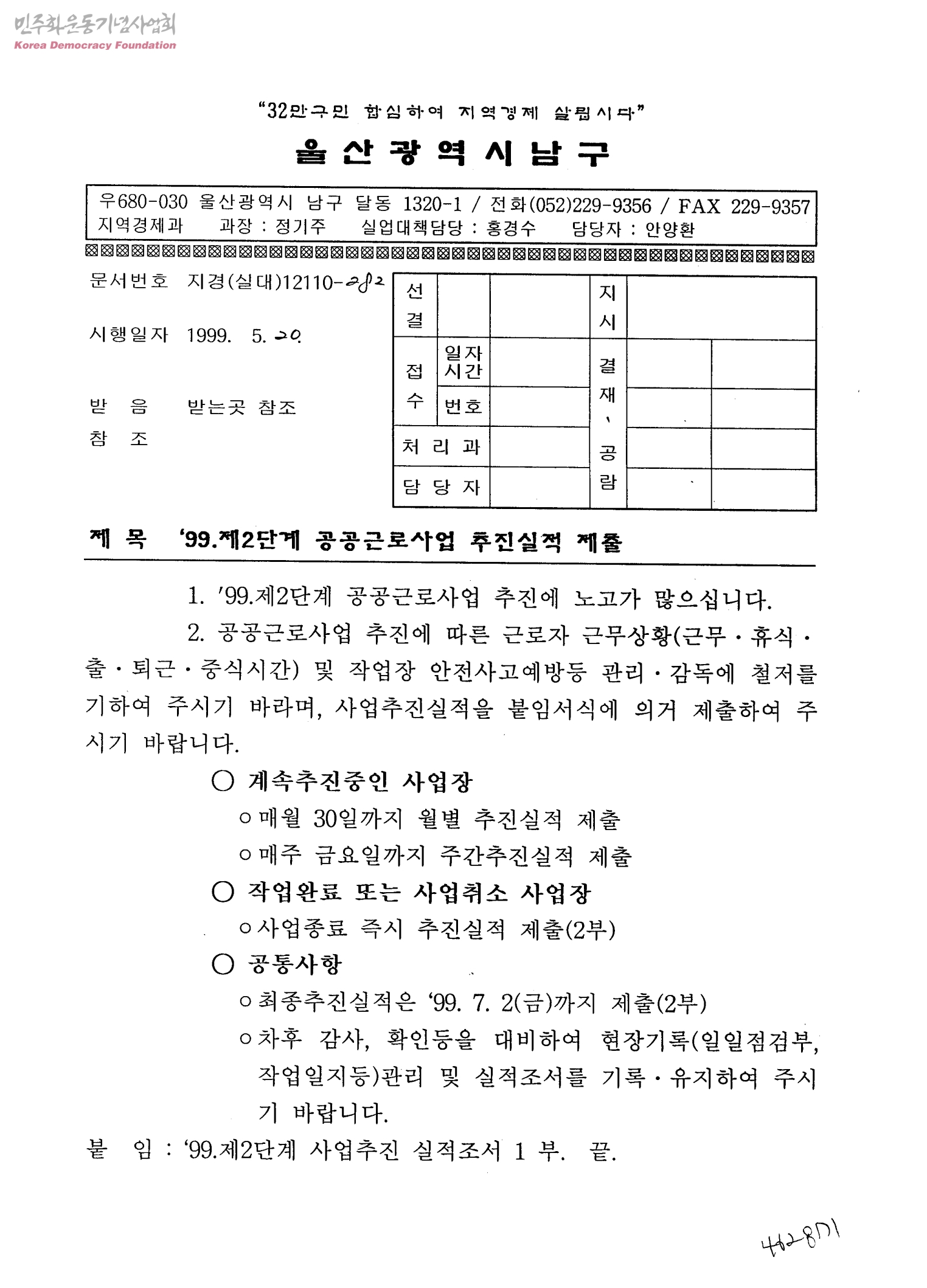 '99.제2단계 공공근로사업 추진실적 제출[수신:고01-14,남구보건소,도01-14,시법무담당관실,정보관리담당관실,자치행정과,경제정책과,실업대책반,회계과,산림녹지과,차량등록사업소,문화예술회관,상수도사업본부회야정수장,용연하수처리장,울산대학교,남부경찰서,강남교육청,남울산우체국,남울산전화국,울산지방노동사무소,부산보호관찰소울산지소,근로복지공단,한국산업인력관리공단외]