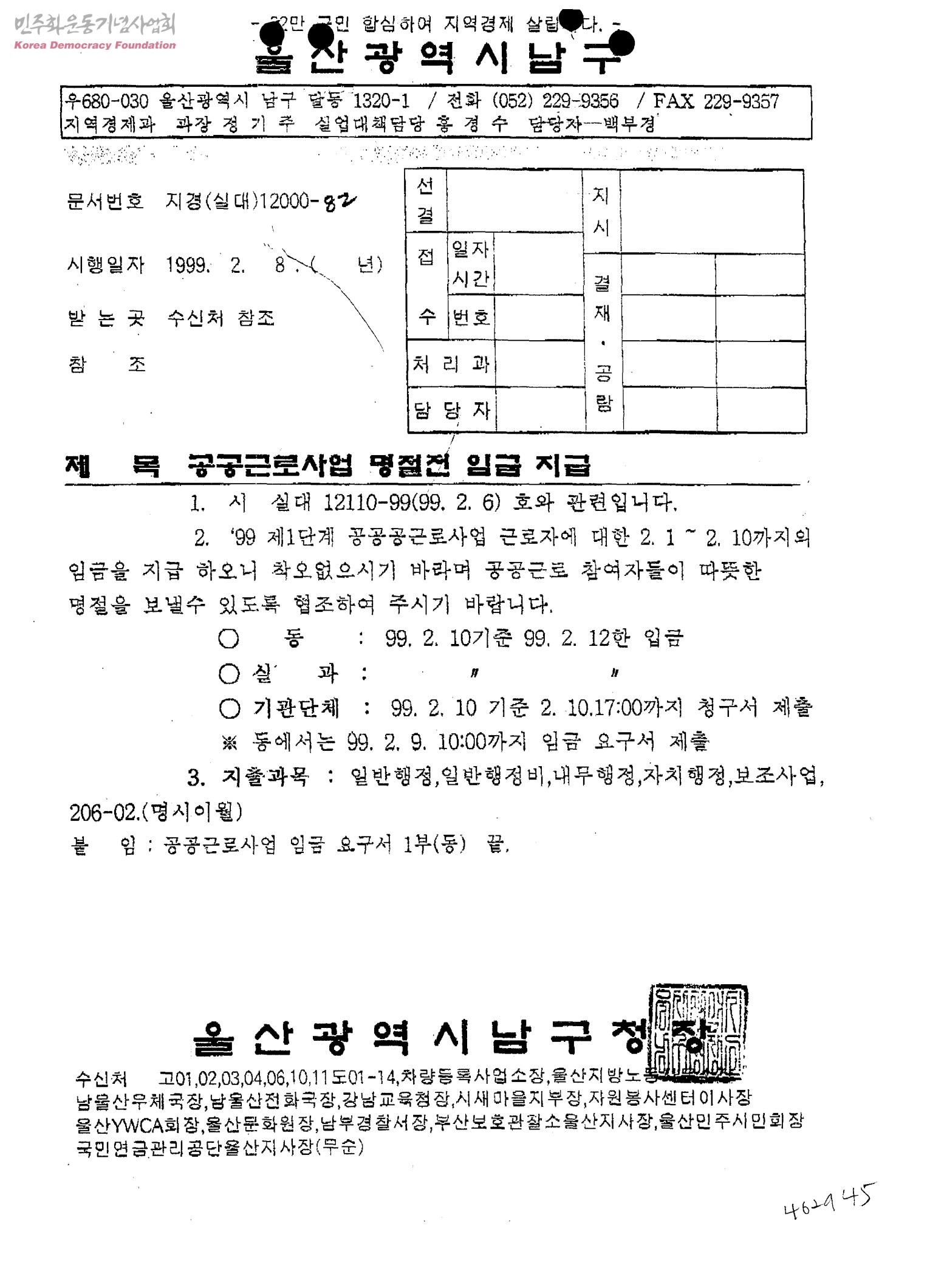 공공근로사업 명절전 임급 지금[수신:고01,02,03,04,06,10,11,도01-14,차량등록사업소장,울산지방노동사무소장,남울산우체국장,남울산전화국장,강남교육청장,시새마을지부장,자원봉사센터이사장,울산YWCA회장,울산문화원장,남부경찰서장,부산보호관찰소울산지사장,울산민주시민회장,국민연금관리공단울산지사장,발신:울산광역시남구청]