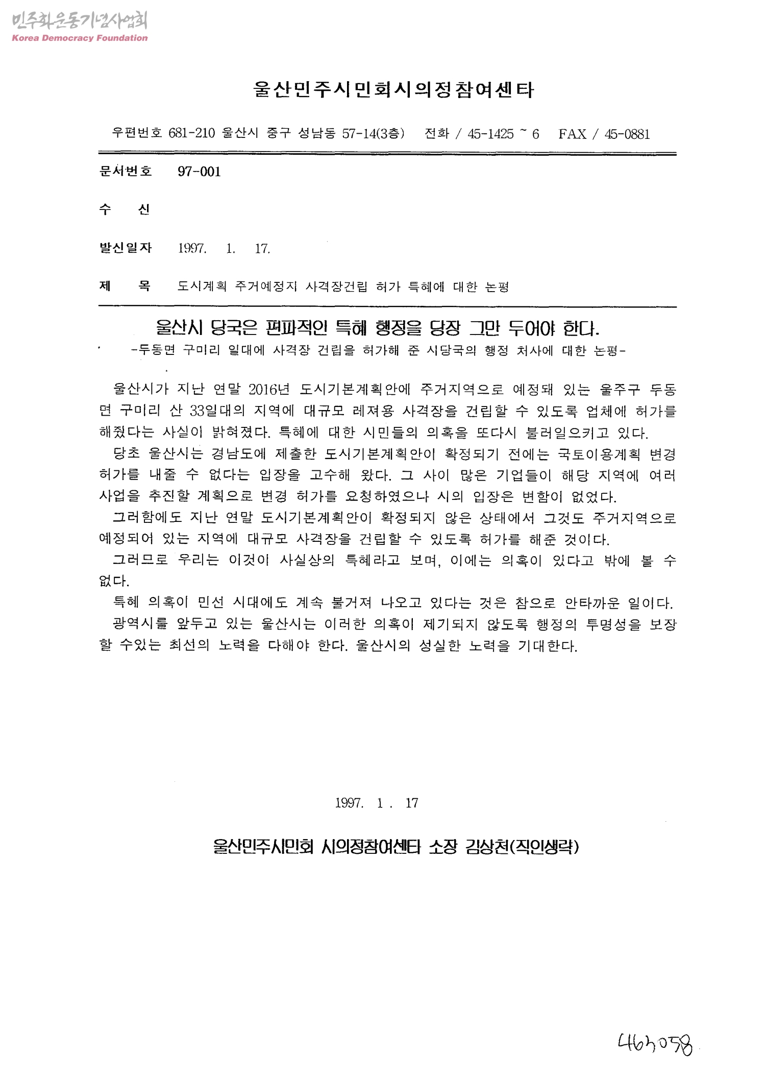 도시계획 주거예정지 사격장건립 허가 특혜에 대한 논평