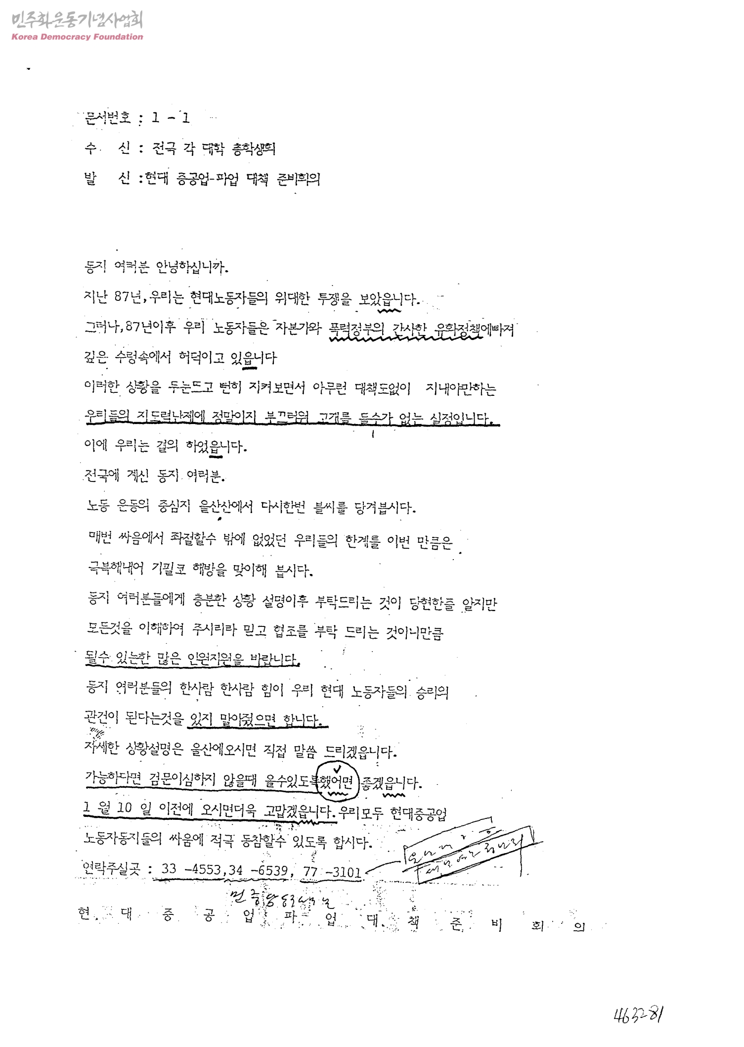 [현대중공업-파업대책분비회의가 전국 각 대학 총학생회에게 보내는 현대중공업 파업 동참요구에 관한 수발신문서]