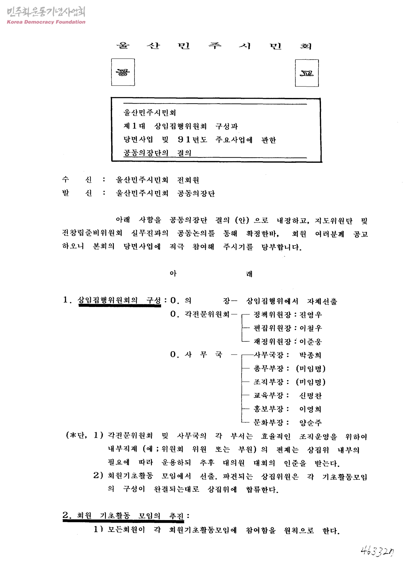 울산민주시민회 제1대 상임집행위원회 구성과 당면사업 및 91년도 주요사업에 관한 공동의장단의 결의[수신:울산민주시민회 전회원, 발신:울산민주시민회 공동의장단]