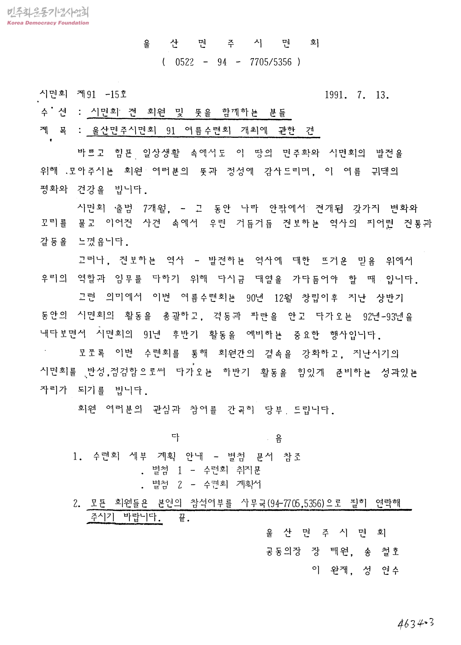 울산민주시민회 91 여름수련회 개최에 관한 건[수신:시민회 전 회원 및 뜻을 함께하는 분들]