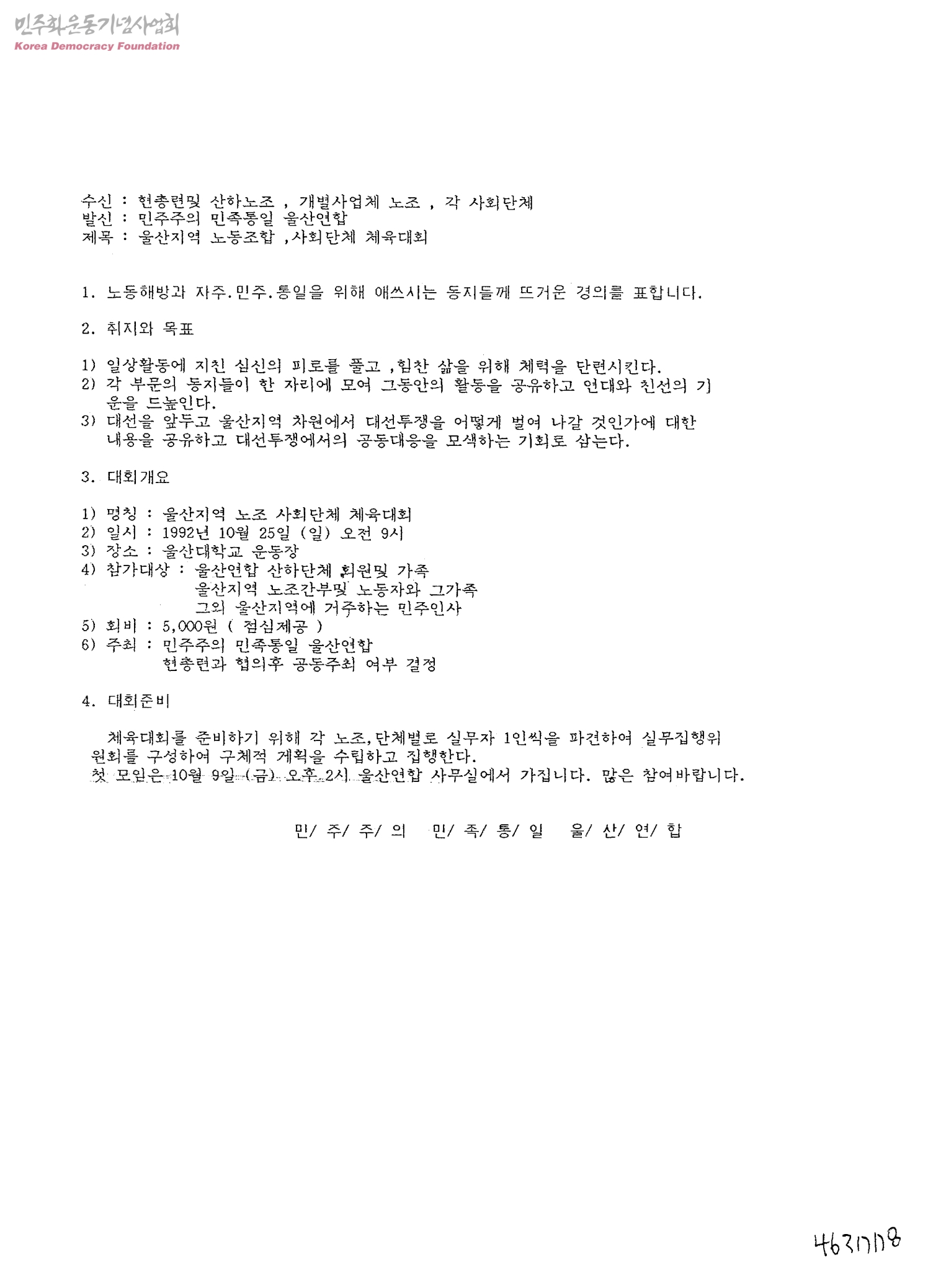 울산지역 노동조합, 사회단체 체육대회[수신: 현총련및 산하노조, 개별사업체 노조, 각 사회단체, 발신: 민주주의 민족통일 울산연합]