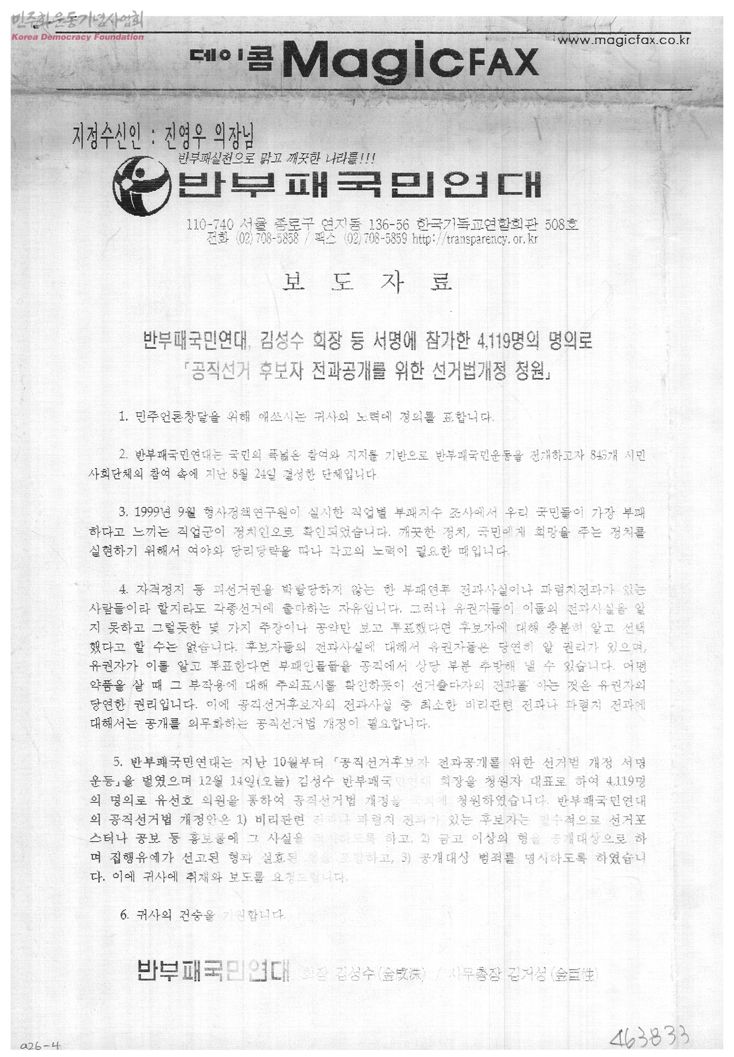 보도자료-반부패국민연대, 김성수회장 등 서명에 참가한 4,119의 명의로「공직선거 후보자 전과공개를 위한 선거법개정 청원」