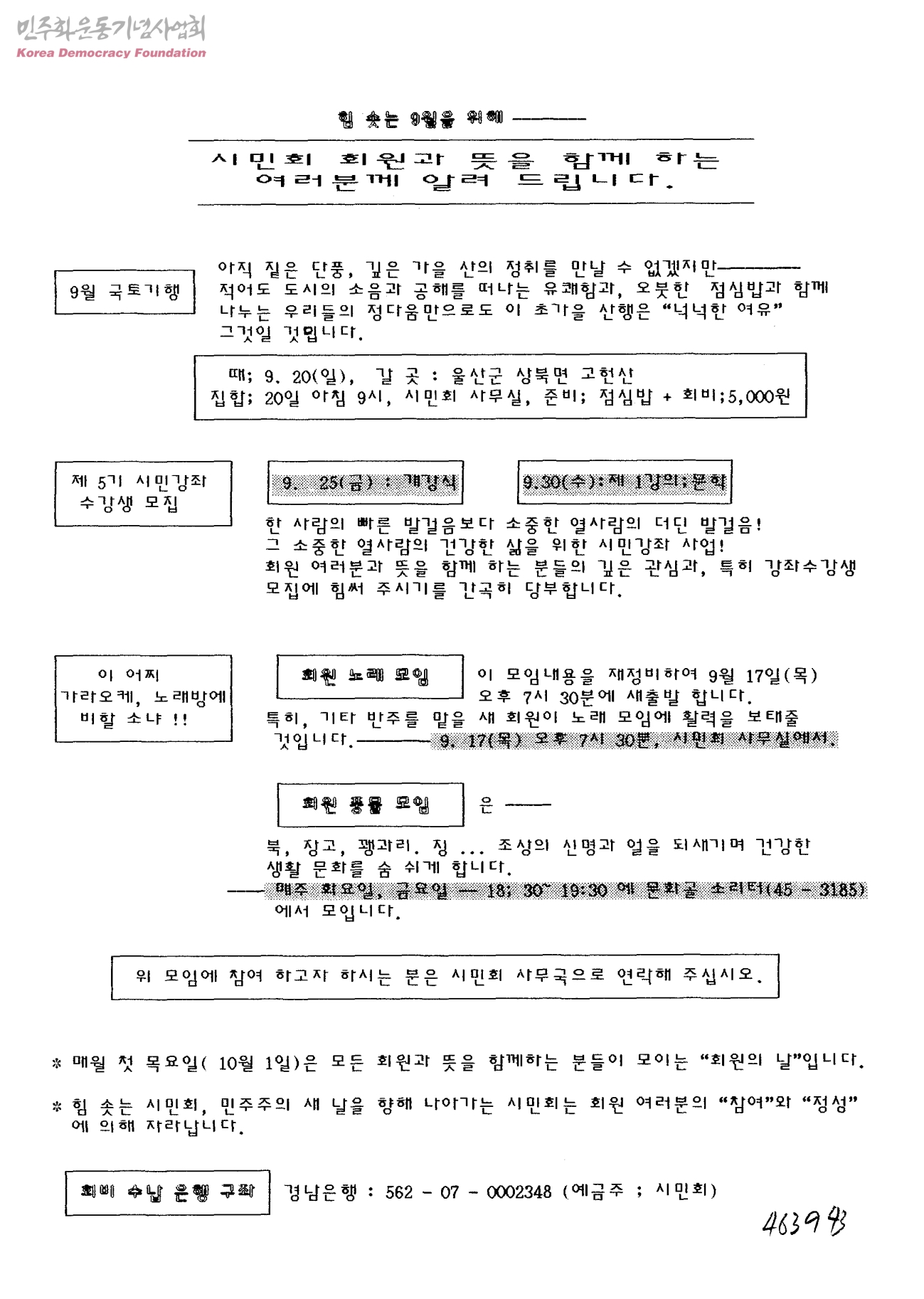 힘 솟는 9월을 위해-시민회 회원과 뜻을 함께 하는 여러분께 알려 드립니다