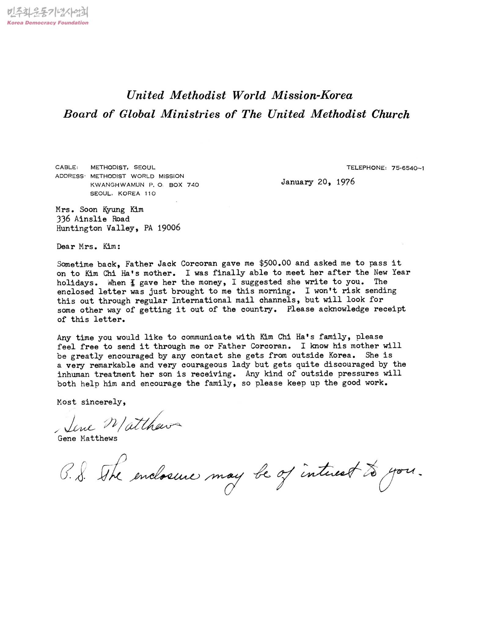- 필라델피아한국수난자가족돕기회에서 보내준 성금을 미 감리교 세계 선교부 Gene Matthews가 김지하의 모친에게 전해 주었다는 내용의 편지와 성금 송금에 대한 김지하 모친의 감사의 글이 동봉되어 있음