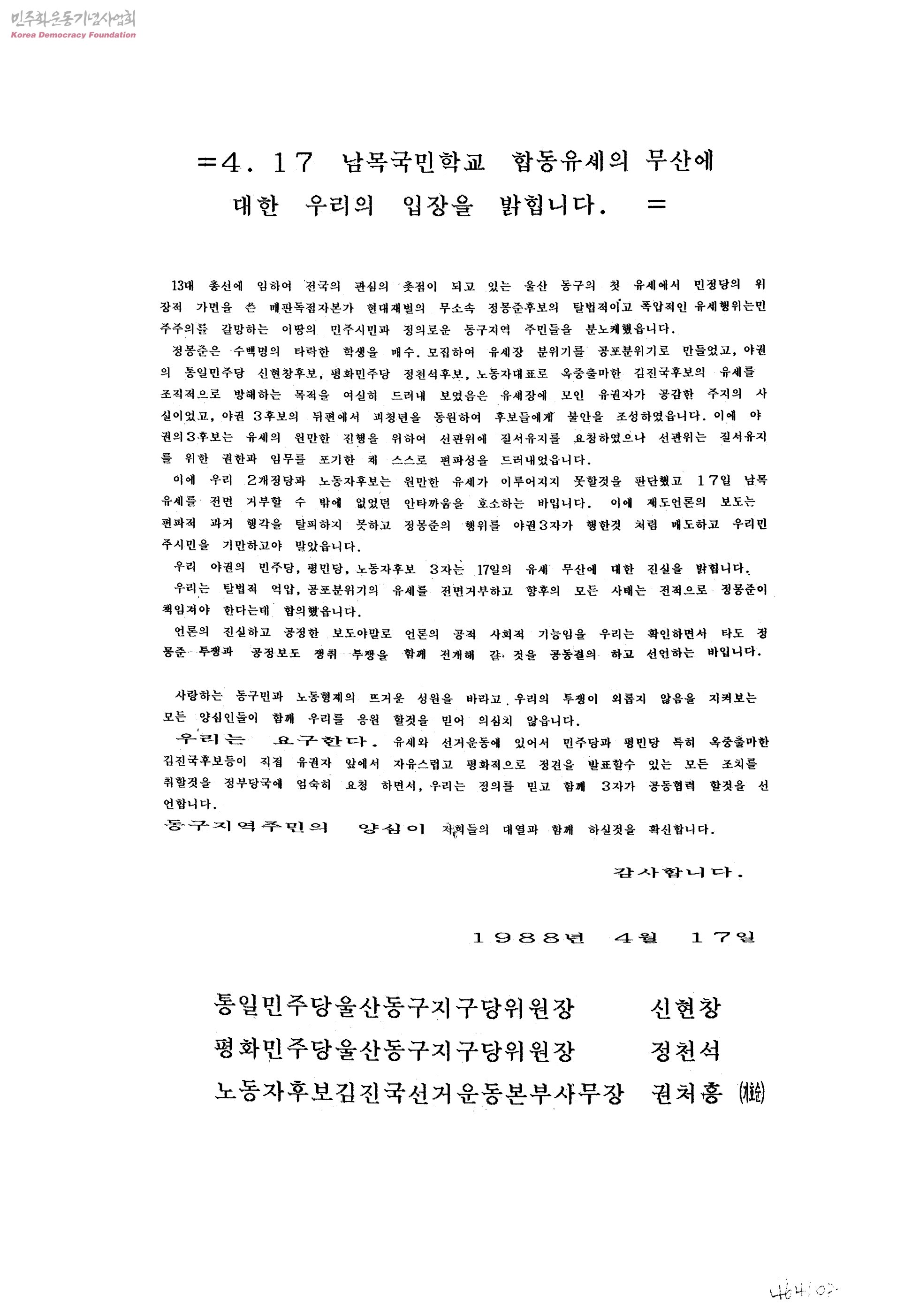 4.17 남목국민학교 합동유세의 무산에 대한 우리의 입장을 밝힙니다