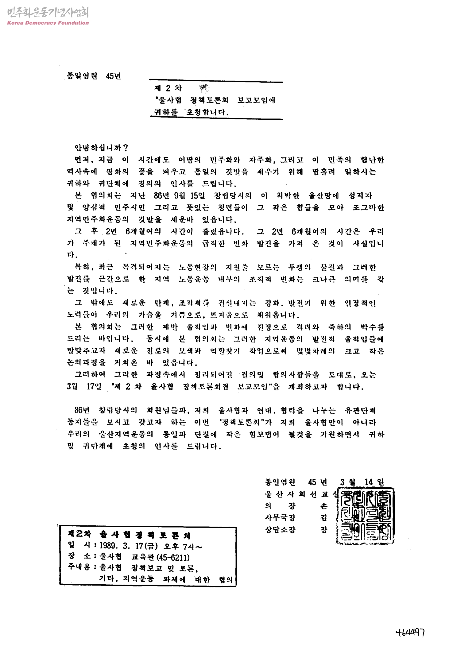제2차 울사협 정책토론회 보고모임에 귀하를 초청합니다