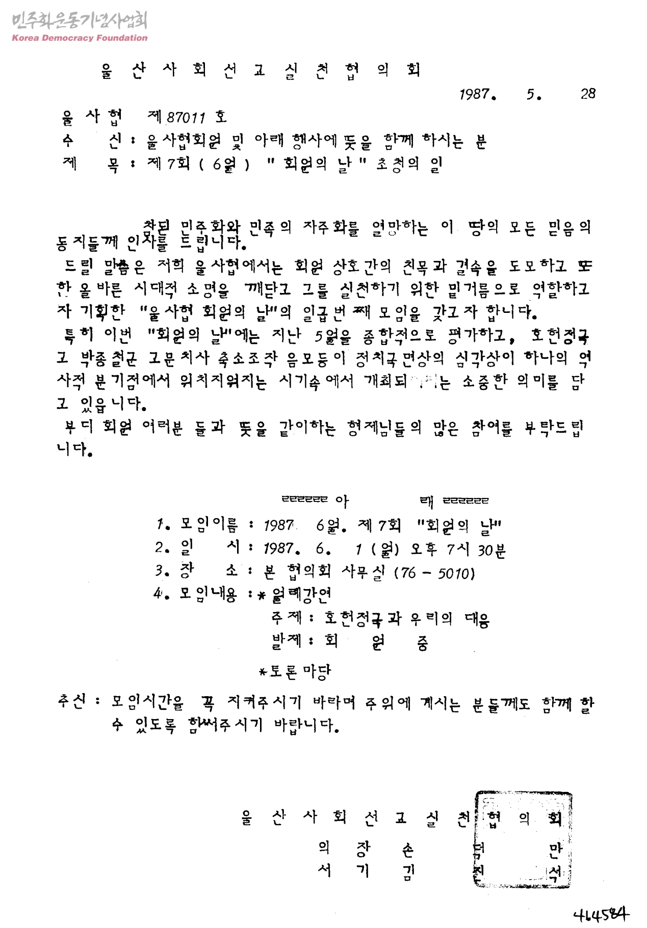 제7회 (6월) "회원의 날" 초청의 일[수신:울사협회원 및 행사에 뜻을 함께 하시는 분]