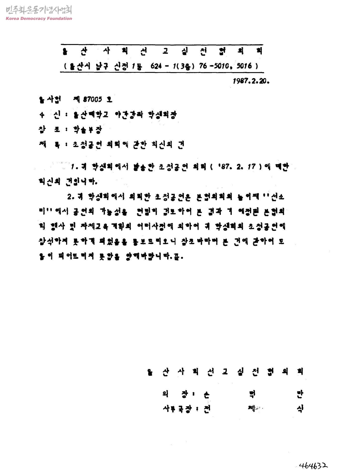 초청공연 의뢰에 관한 회신의 건[수신:울산대학교 야간강좌 학생회장]