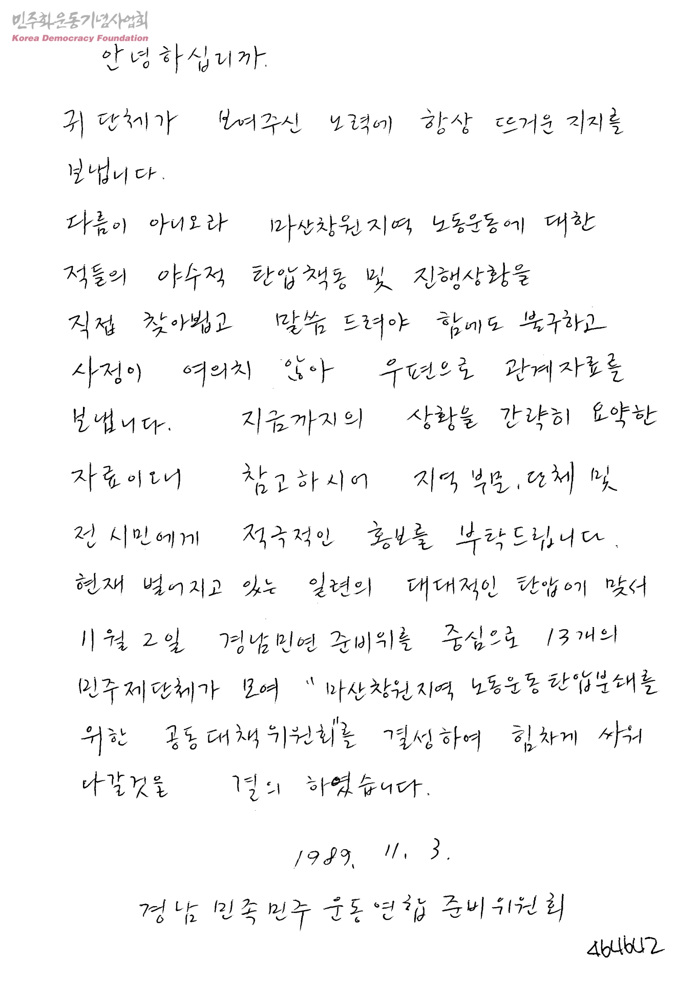 [발신자가 수신자에게 보내는 마산창원지역 노동운동관련 수,발신 문서]
