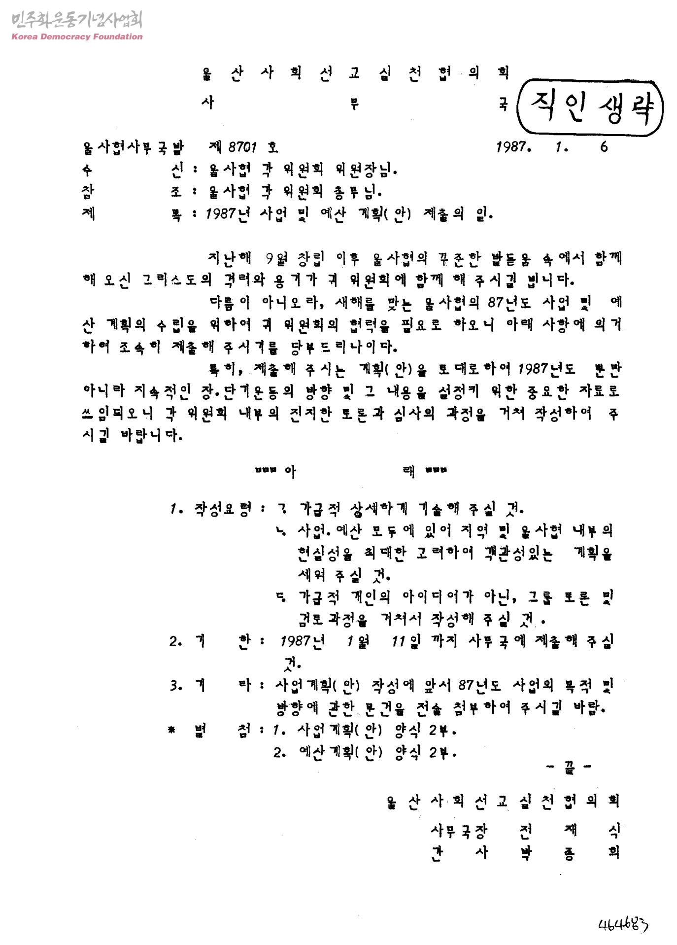 1987년 사업 및 예산 계획(안) 제출의 일[수신:울사협 각 위원회 위원장님]