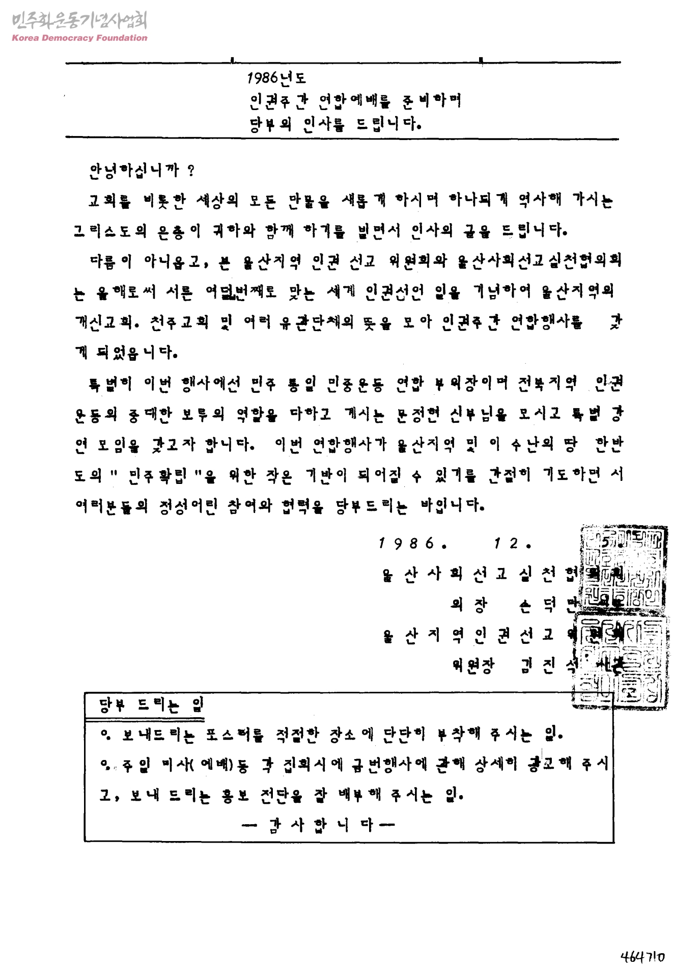 1986년도 인권주간 연합예배를 준비하며 당부의 인사를 드립니다