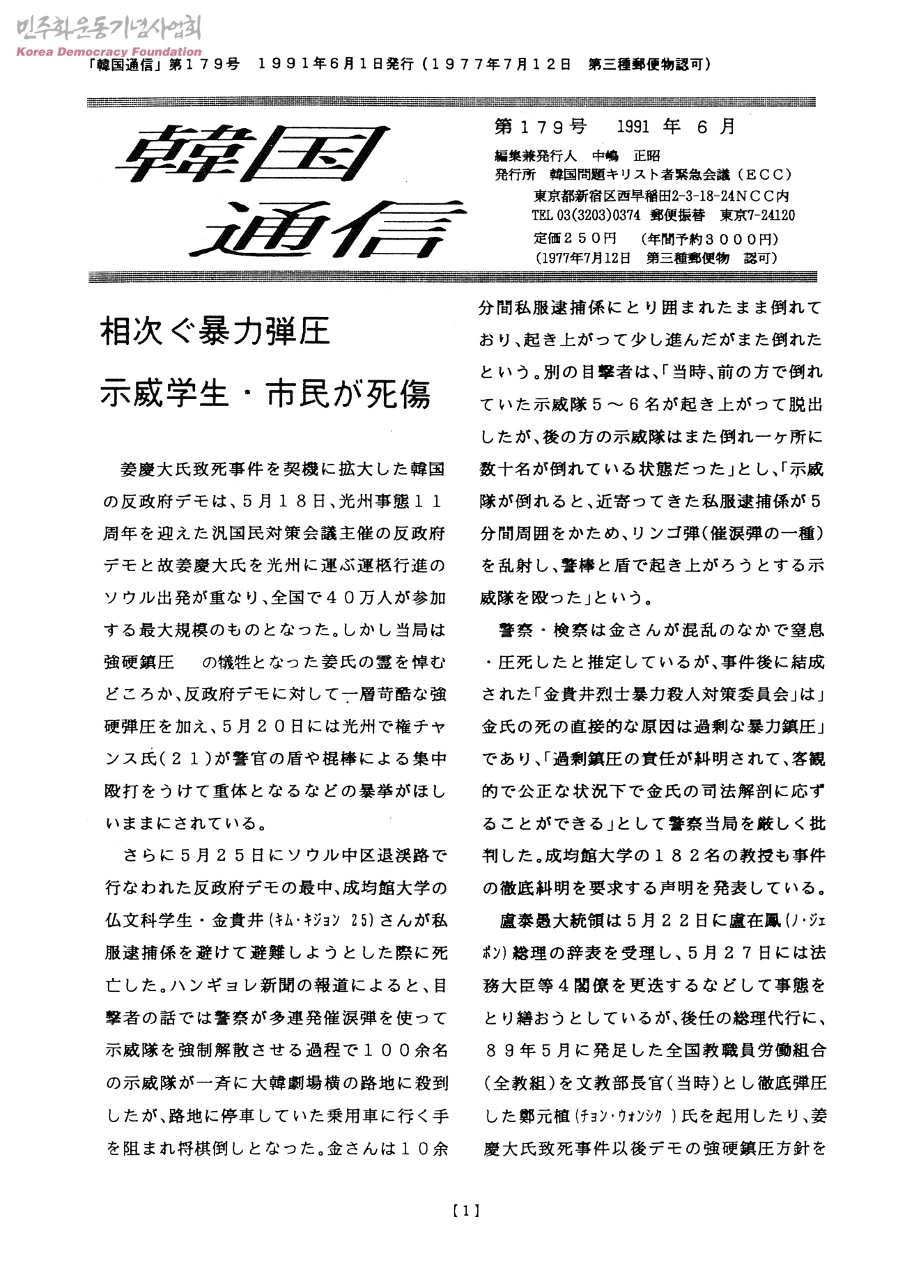 - 相次ぐ暴力彈壓示威學生ㆍ市民が死傷, 廣域議會選擧と第6共和國<中間評價>(ハンギョレ新聞5月31日付社說), 韓半島非核化1千人宣言-核査察南北同時實施等を要求, 韓進重工業勞組委員長ㆍ朴昌洙氏の疑問死 외