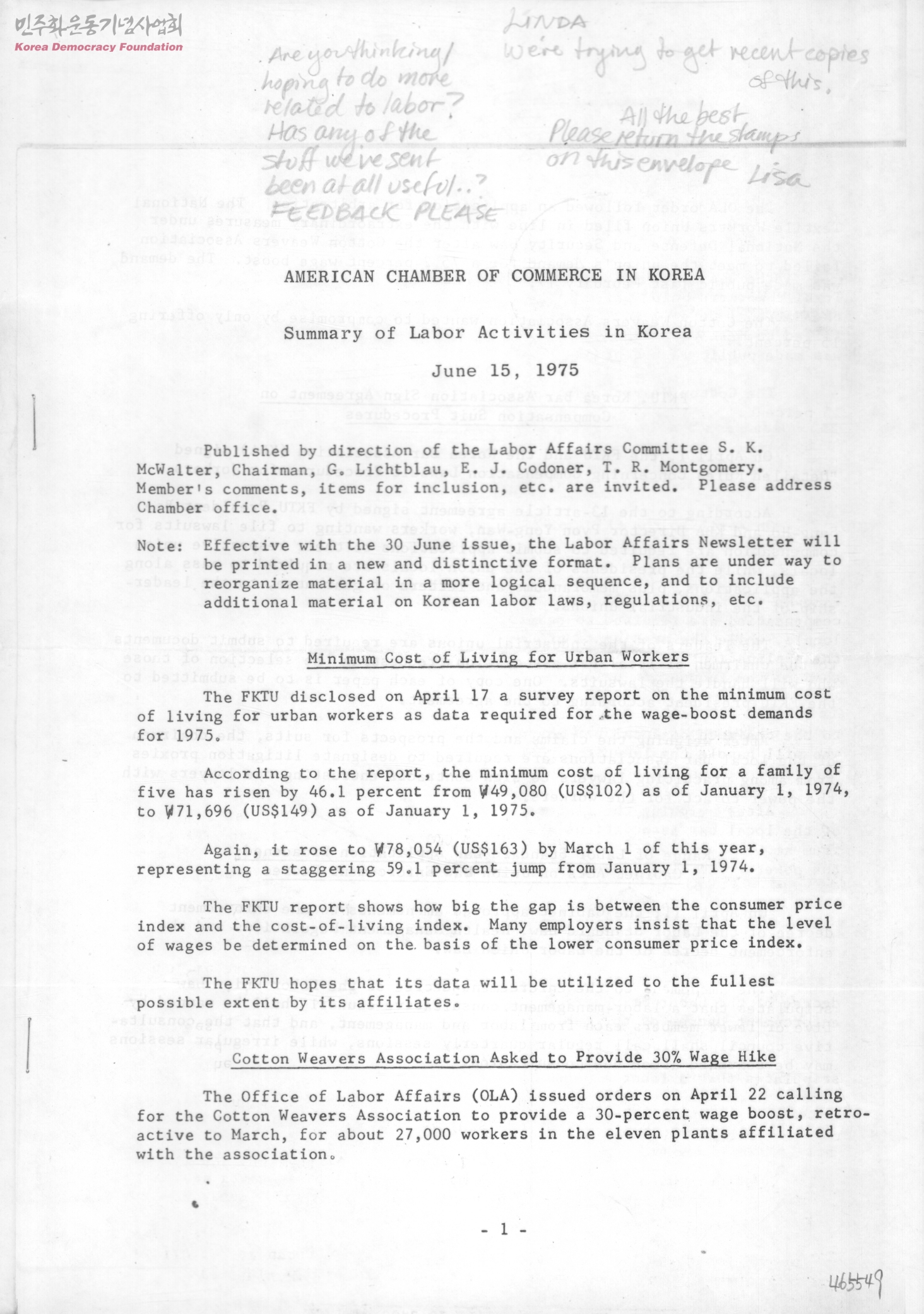 - 1. 도시근로자의 최소생계비 2. 면직물협회의 30%임금인상 요구 3. FKTU(한국노동조합총연맹), 대한변호사협회 배상소송절차에 동의서명 4. 노동기준법 적용범위확대; 노동기준법 시행법령의 개정승인 5. FKTU(한국노동조합총연맹)가 단체교섭 공개토론회를 후원하다 6. Sisa News 요약(1975.5.19~1975.6.1)