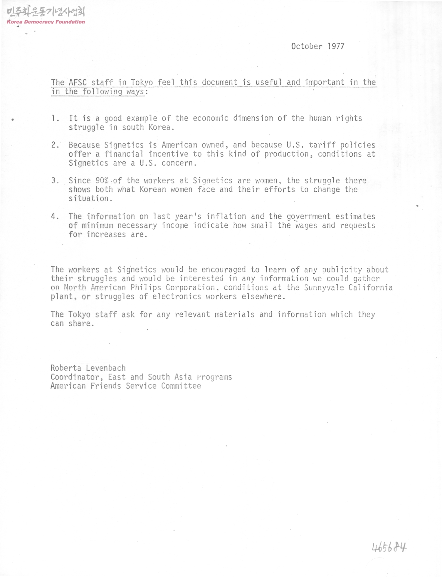 - 1. Roberta Levenbach가 작성한 Signetics Korea 자료 2. Ed Kinchley가 1977.9.15자로 작성한 Signetics Korea 노동자들의 연좌항의 관련 자료.
