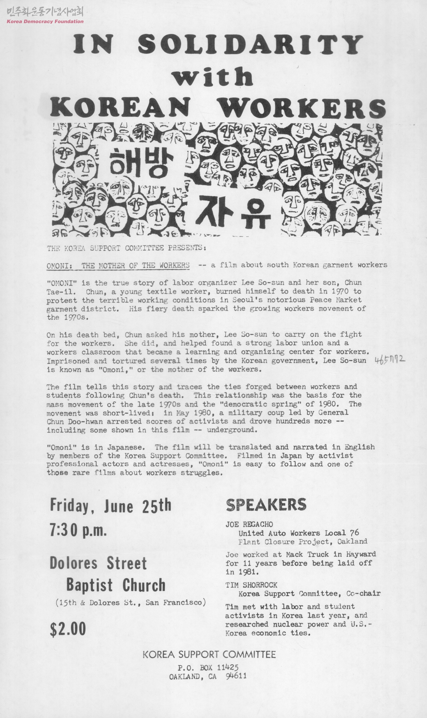- 1. 전태일의 어머니 이소선을 주제로 하는 "OMONI"상영 안내문 2. KWANGMINSA, CONTROL DATA 사건 관련 자료 첨부.