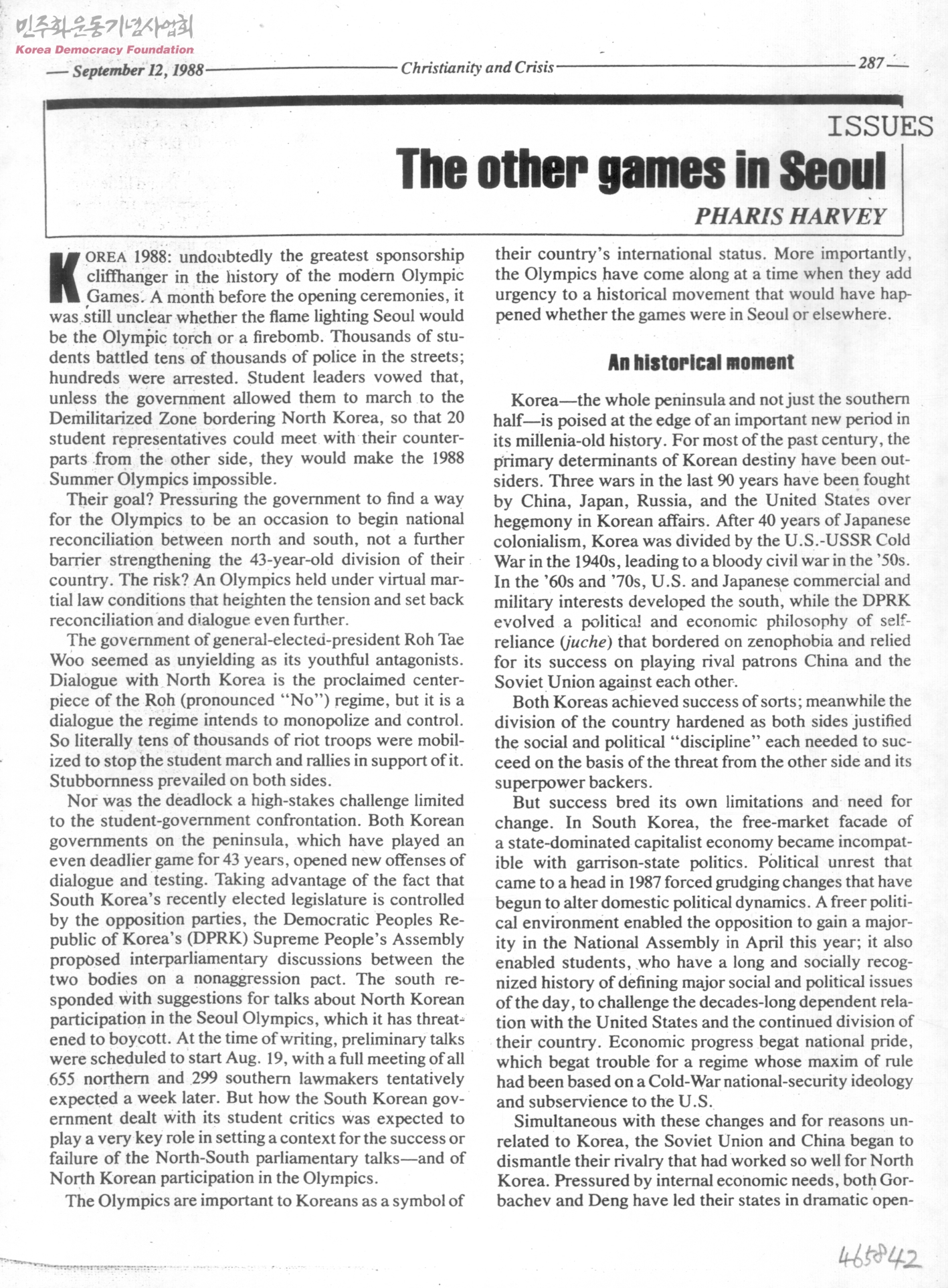 - 1988년 올림픽 개최와 남북 정치 상황에 대한 기사.