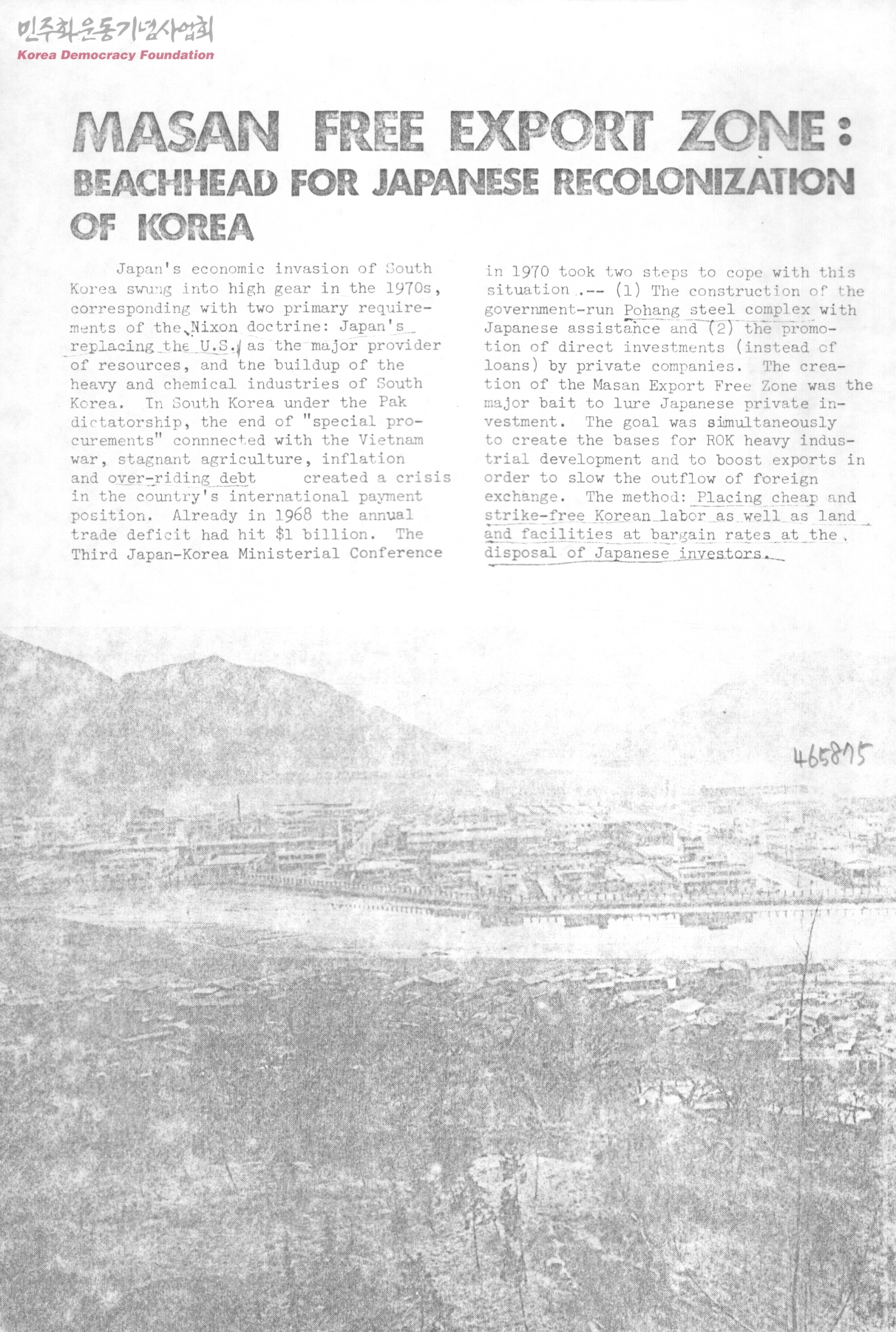 - 마산수출자유지역내 일본기업의 진출을 자본에 의한 일본의 재식민화 과정으로 본다는 논지의 자료.