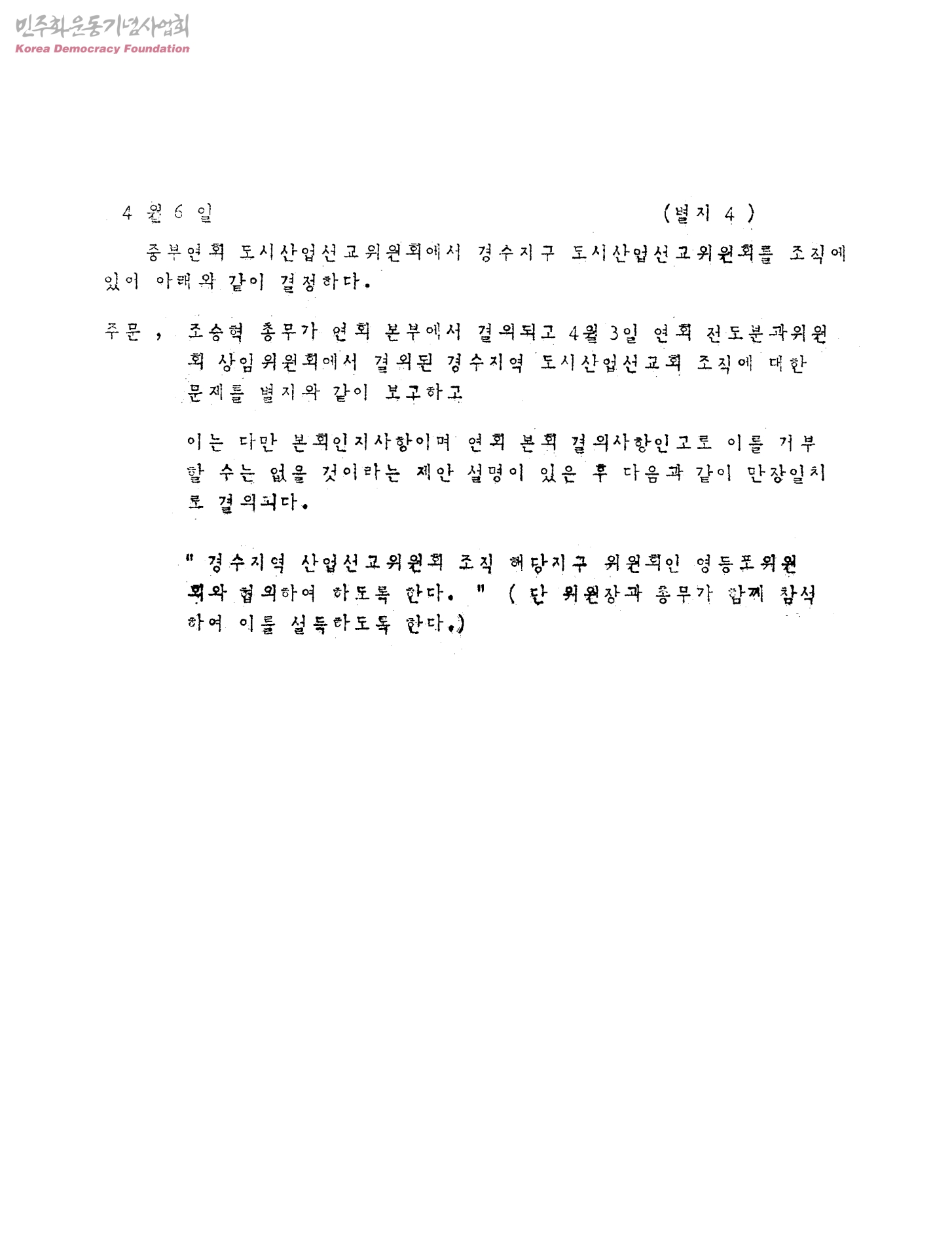 [4월6일 중부연회 도시산업선교위원회의 경수지구 도시산업선교위원회 조직 관련 결정사항]