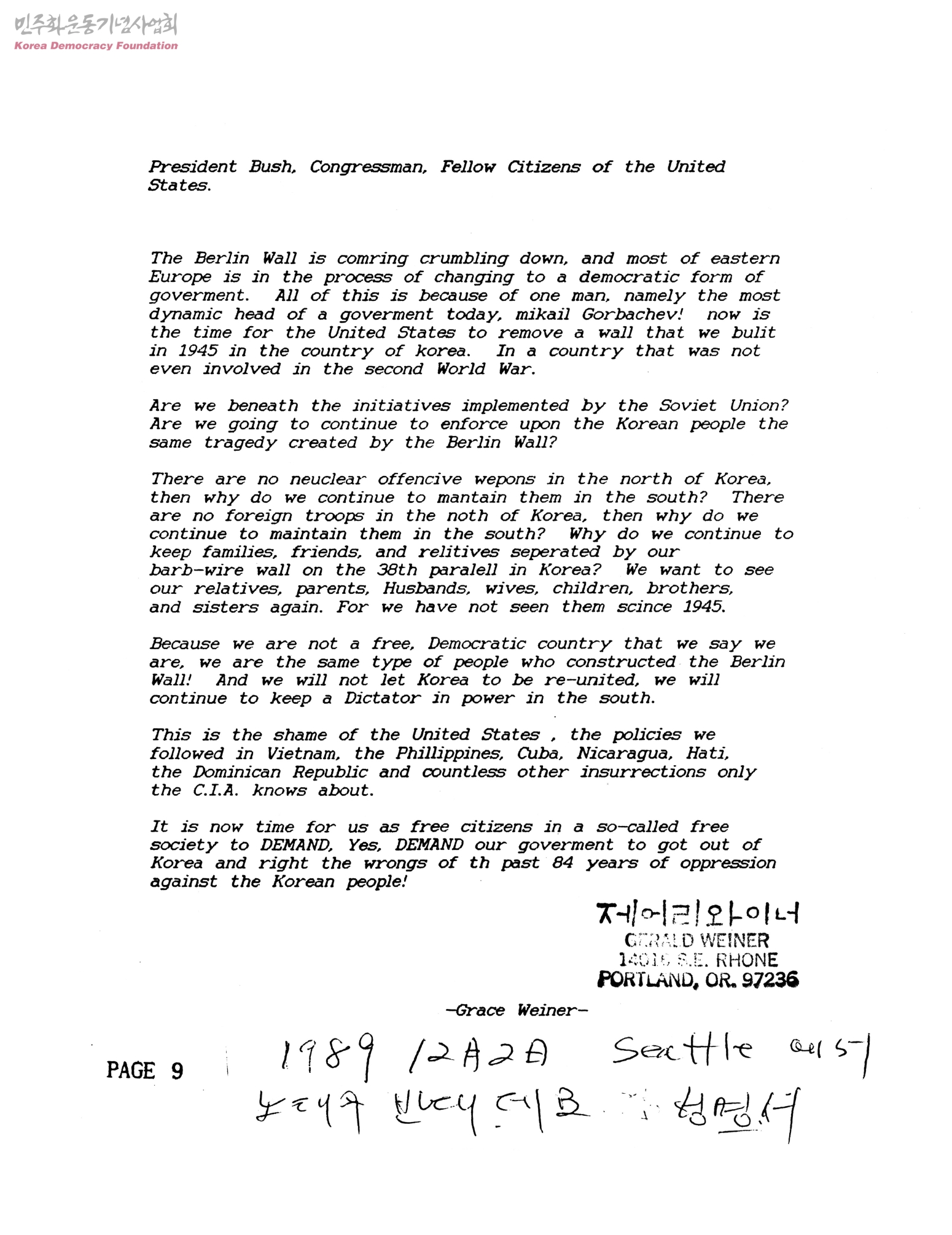 President Bush, Congressman, Fellow Citizens of the United States[노태우 반대 데모 성명서(1989.12.2, Seattle)]