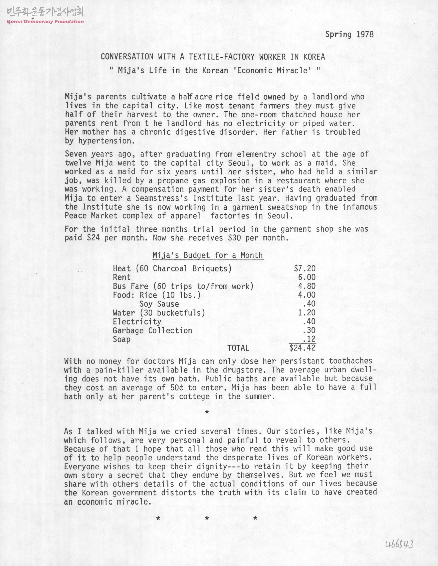 CONVERSATION WITH A TEXTILE-FACTORY WORKER IN KOREA-"Mija's Life in the Korean 'Economic Miracle'"