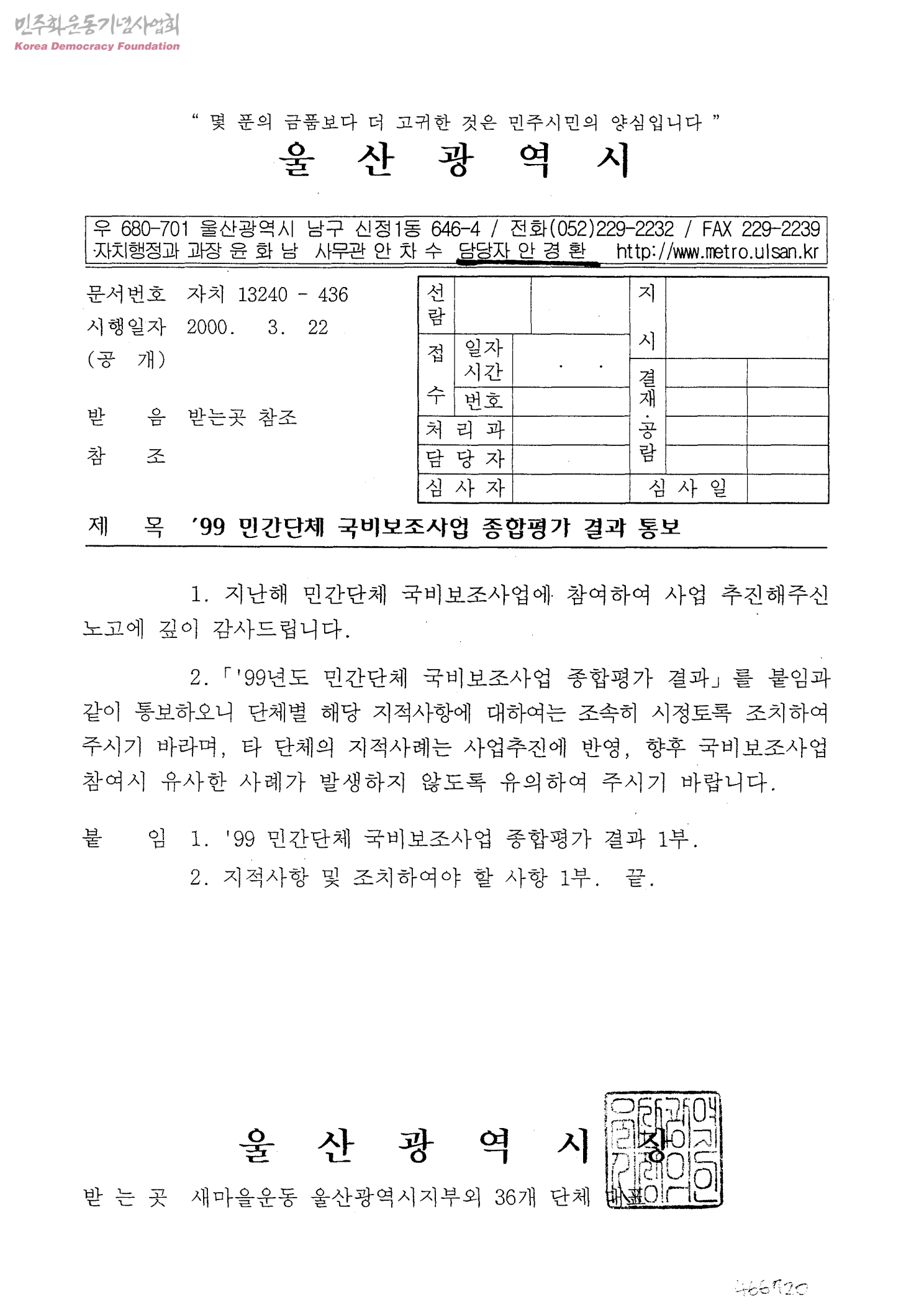 '99 민간단체 국비보조사업 종합평가 결과 통보[수신:새마을운동울산광역시지부외36개단체대표, 발신:울산광역시장]
