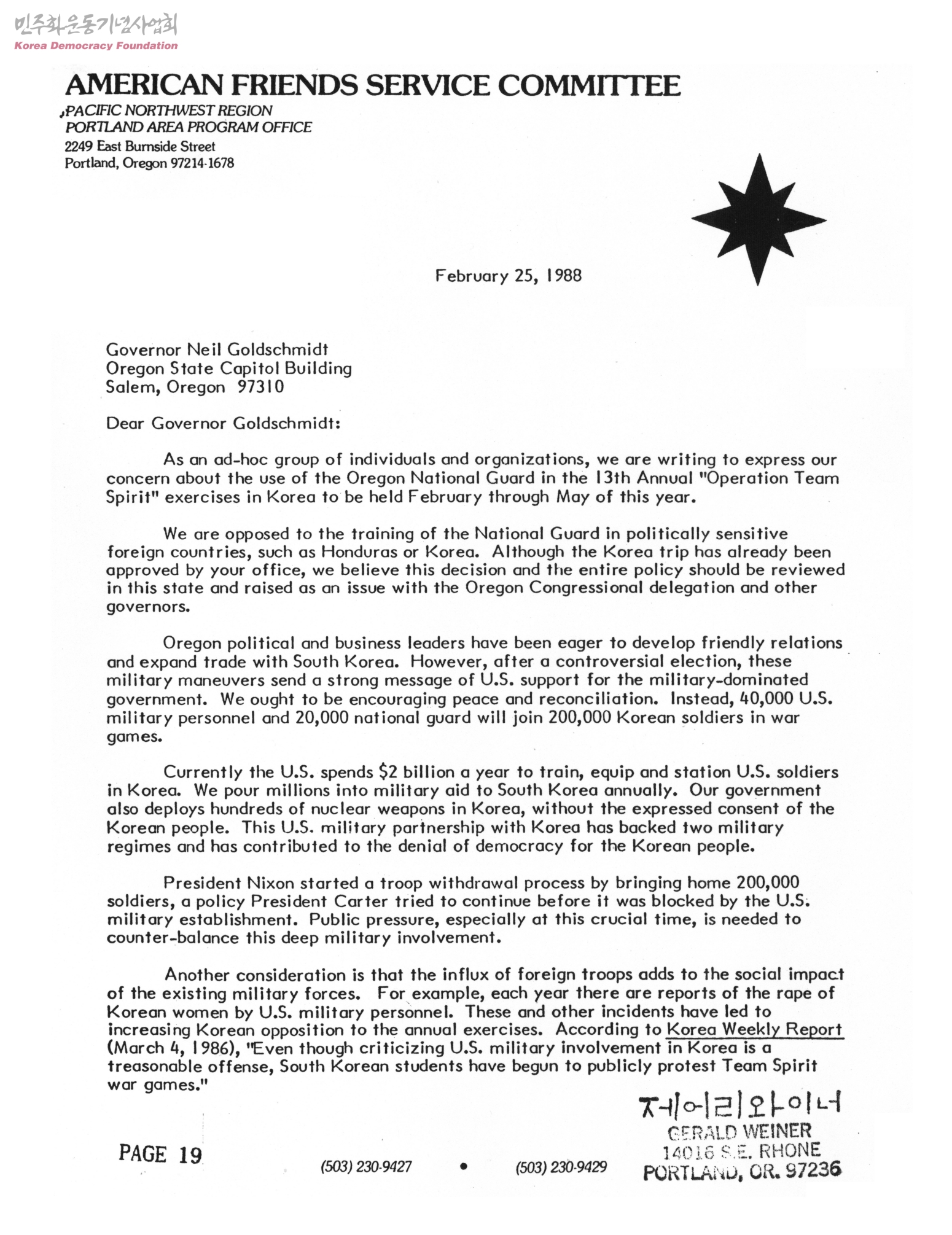 [American Friends Service Committee의 Ms. Paulette Wittwer가 오리건 주지사 Neil Goldschmidt에게 보내는 오리건 주방위군의 Team Spirit훈련 참가에 대한 우려의 글]