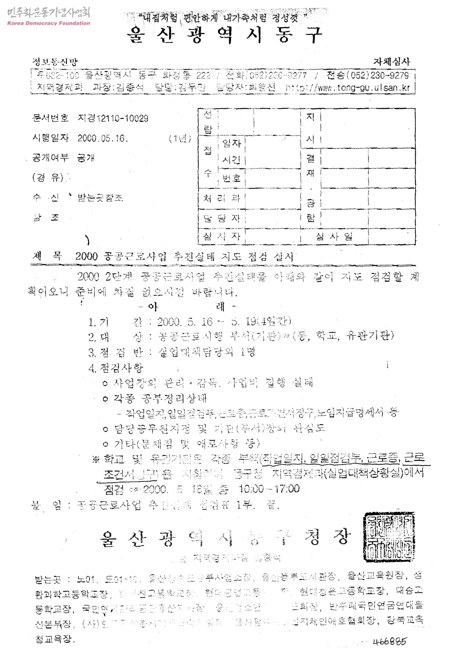 - 첨부-공공근로사업 추진실태 점검표, 울산광역시동구청장, 2000-05-16