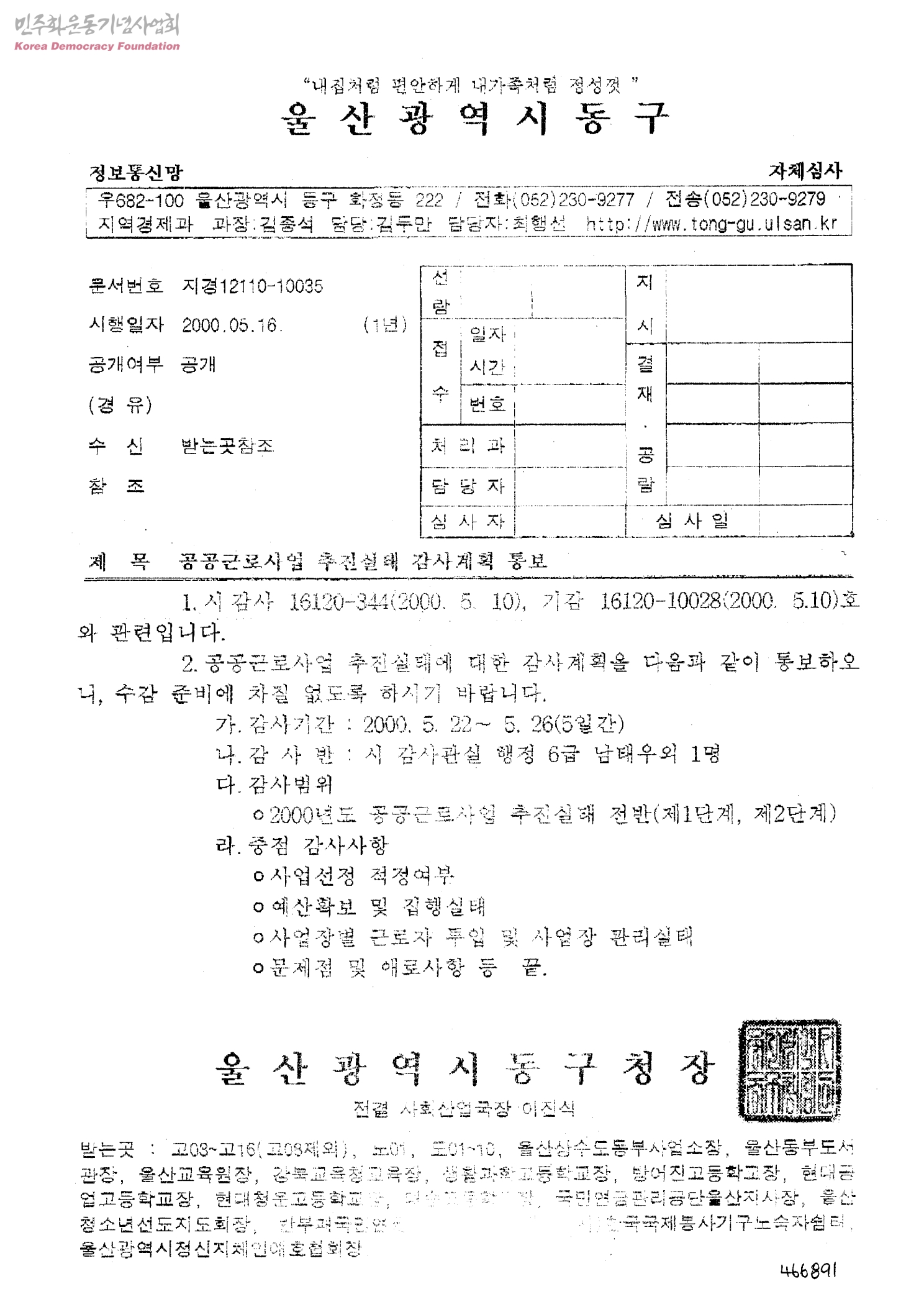 공공근로사업 추진실태 감사계획 통보[수신:고03~고16(고08제외), 노01, 도01~10, 울산상수도동부사업소장, 울산동부도서관장, 울산교육원장, 강북교육청교육장, 생활과학고등학교장, 방어진고등학교장, 현대공업고등학교장, 현대청운고등학교장, 대송고등학교장, 국민연금관리공단울산지사장, 울산청소년선도지도회장, 반부패국민연금연대울산본부장, 한국국제봉사기구노숙자쉼터, 울산광역시정신지체인애호협회장, 발신:울산광역시동구청장]