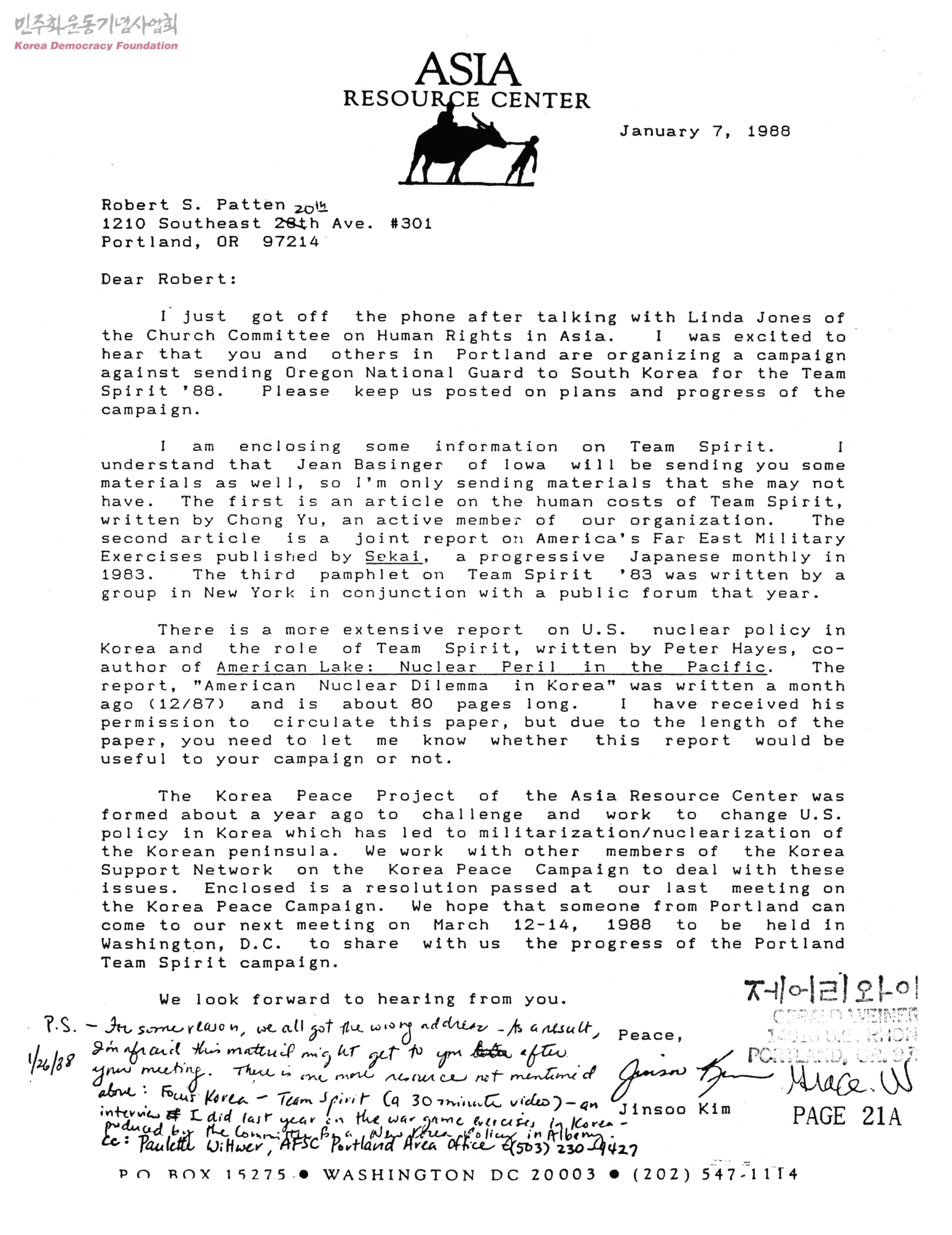 [Asia Resource center에서 Robert S. Patten에게 보내는 Team Spirit 관련 자료 동봉 통지 및 Portland Team Spirit 캠페인 계획ㆍ진행상황 요청 편지]
