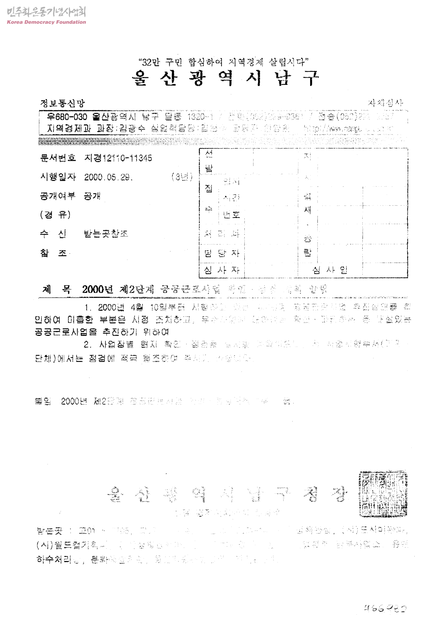 2000년 제2단계 공공근로사업 확인·점검 계획 알림[수신:고01~고05, 고07~고14, 보건소, 도01-14, (시)정책관실, (시)도시미관과, (시)월드컵기획과, (시)생활경제과, (시)자치행정과, 상수도사업본부 남부사업소, 용연하수처리장, 문화예술회관, 울산지방경찰청외39개기관단체, 발신:울산광역시남구청장]