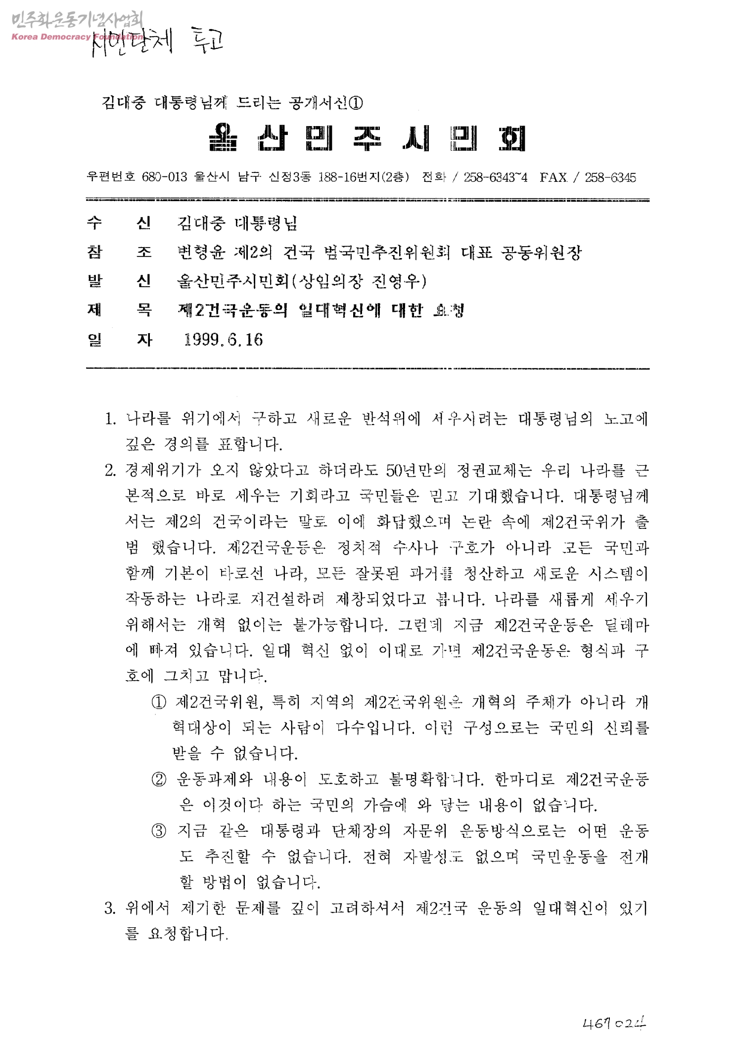 김대중 대통령님께 드리는 공개서신① 제2건국운동의 일대혁신에 대한 요청[수신:김대중 대통령님, 발신:울산민주시민회]