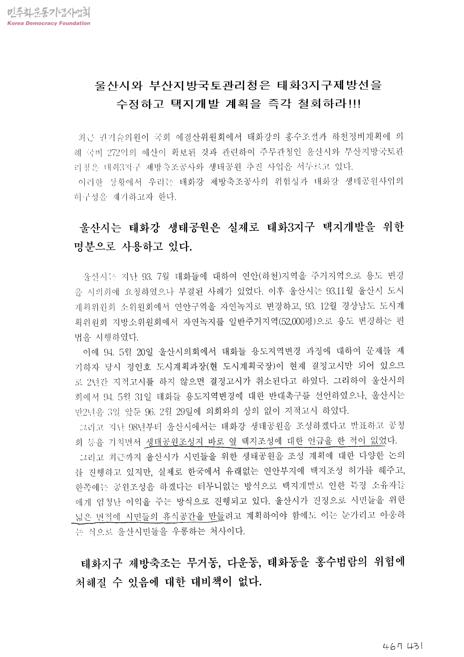 울산시와 부산지방국토관리청은 태화3지구제방선을 수정하고 택지개발 계획을 즉각 철회하라!!!