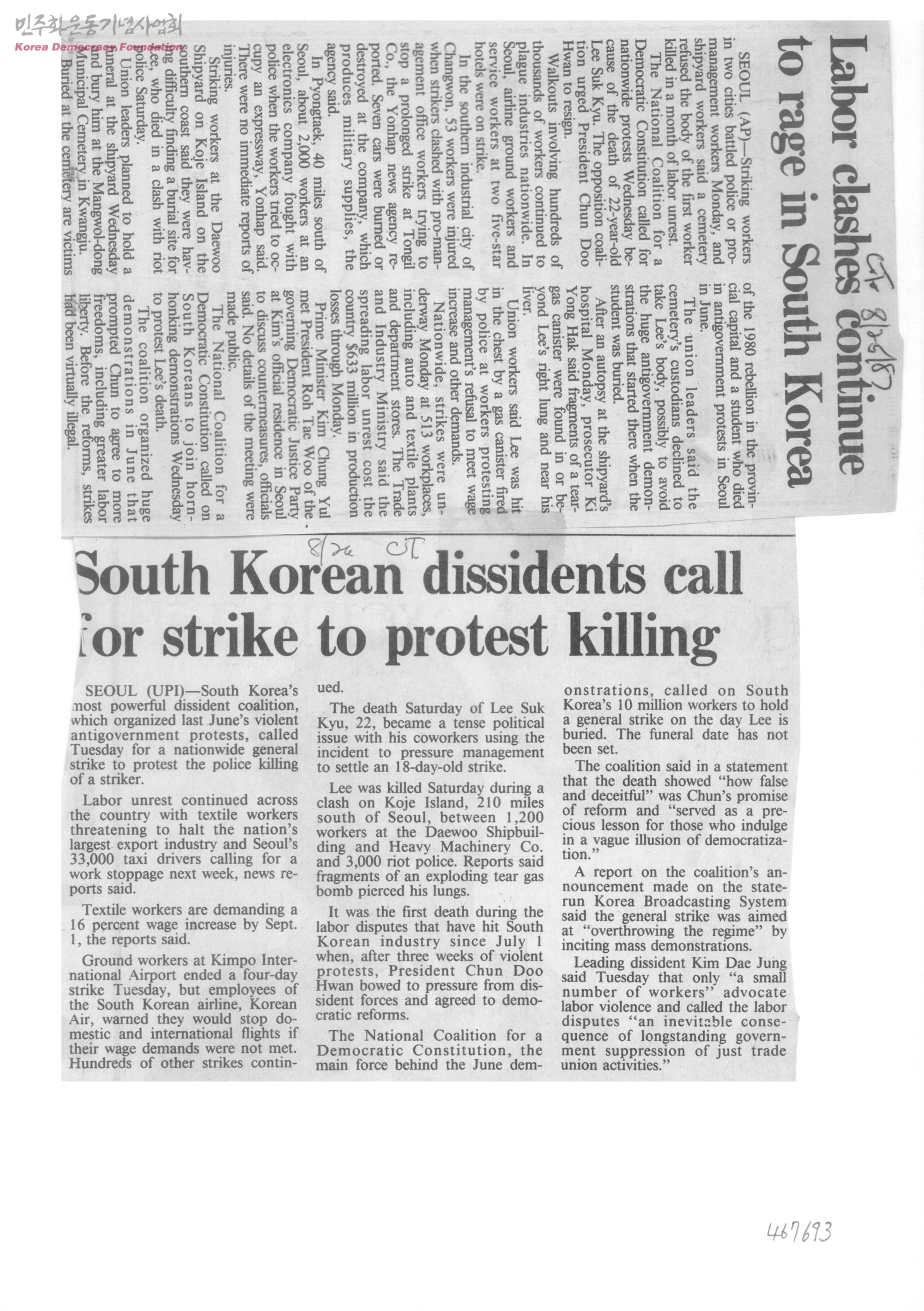- 이석규 열사 사망 관련 규탄 시위(South Korean dissidents call for strike to protest killing).