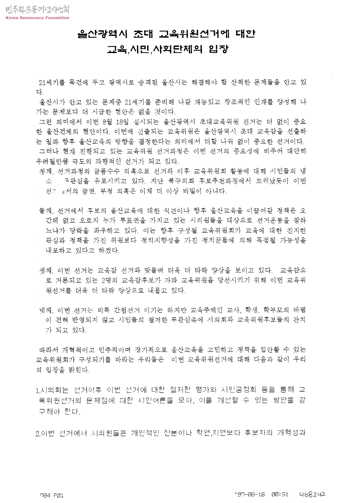 - 울산경제정의실천시민연합, 울산대민주교수협의회, 울산민주시민회, 울산YWCA, 울산참여자치연대, 전국교직원노동조합 울산지부, 참교육을위한전국학부모회 울산지부