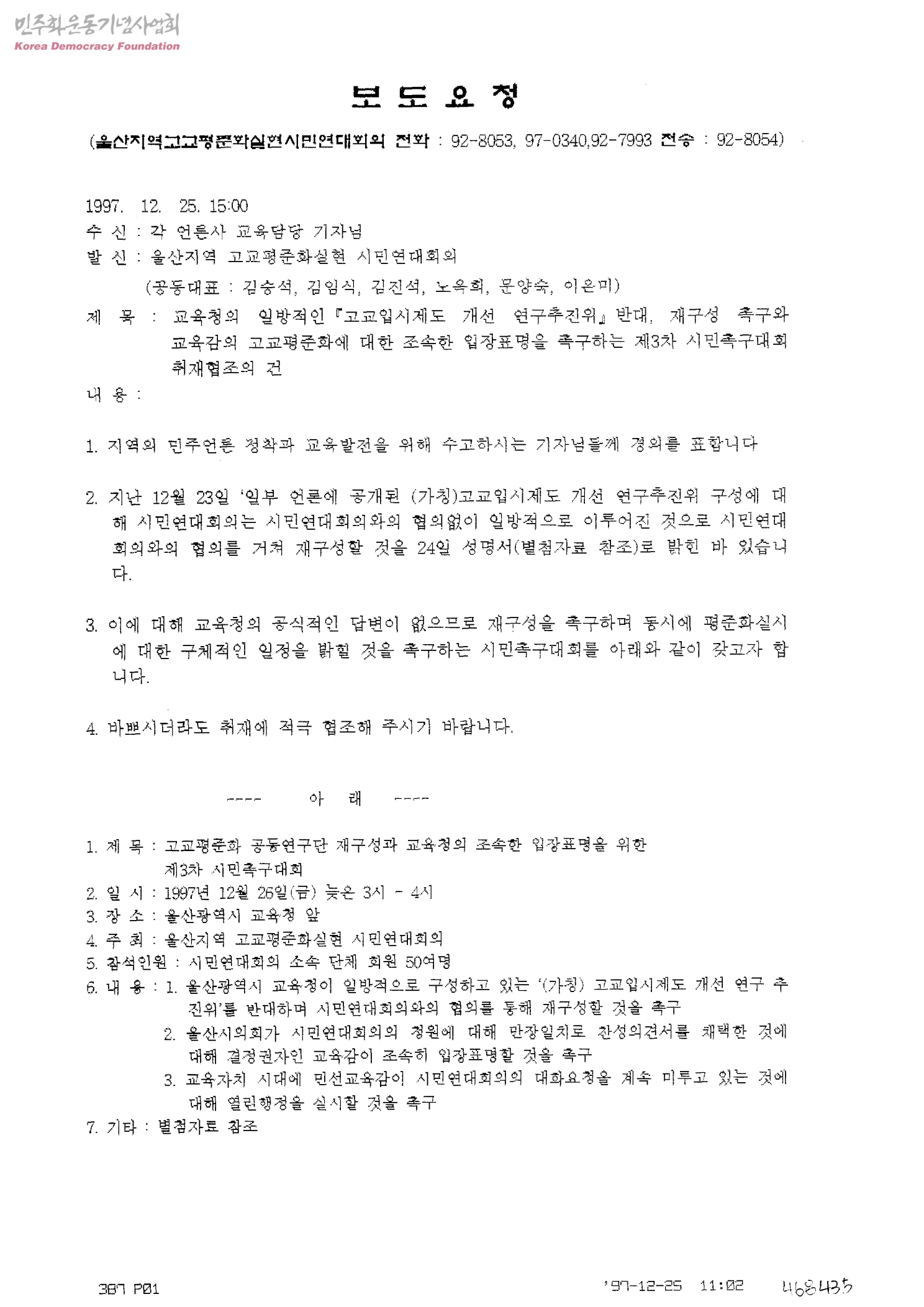 교육청의 일방적인『고교입시제도 개선 연구추진위』반대, 재구성 촉구와 교육감의 고교평준화에 대한 조속한 입장표명을 촉구하는 제3차 시민촉구대회 취재협조의 건[수신:각 언론사 교육담당 기자님, 발신:울산지역 고교평준화 실현 시민연대회의(공동대표 : 김승석, 김임식, 김진석, 노옥희, 문양숙, 이은미)]