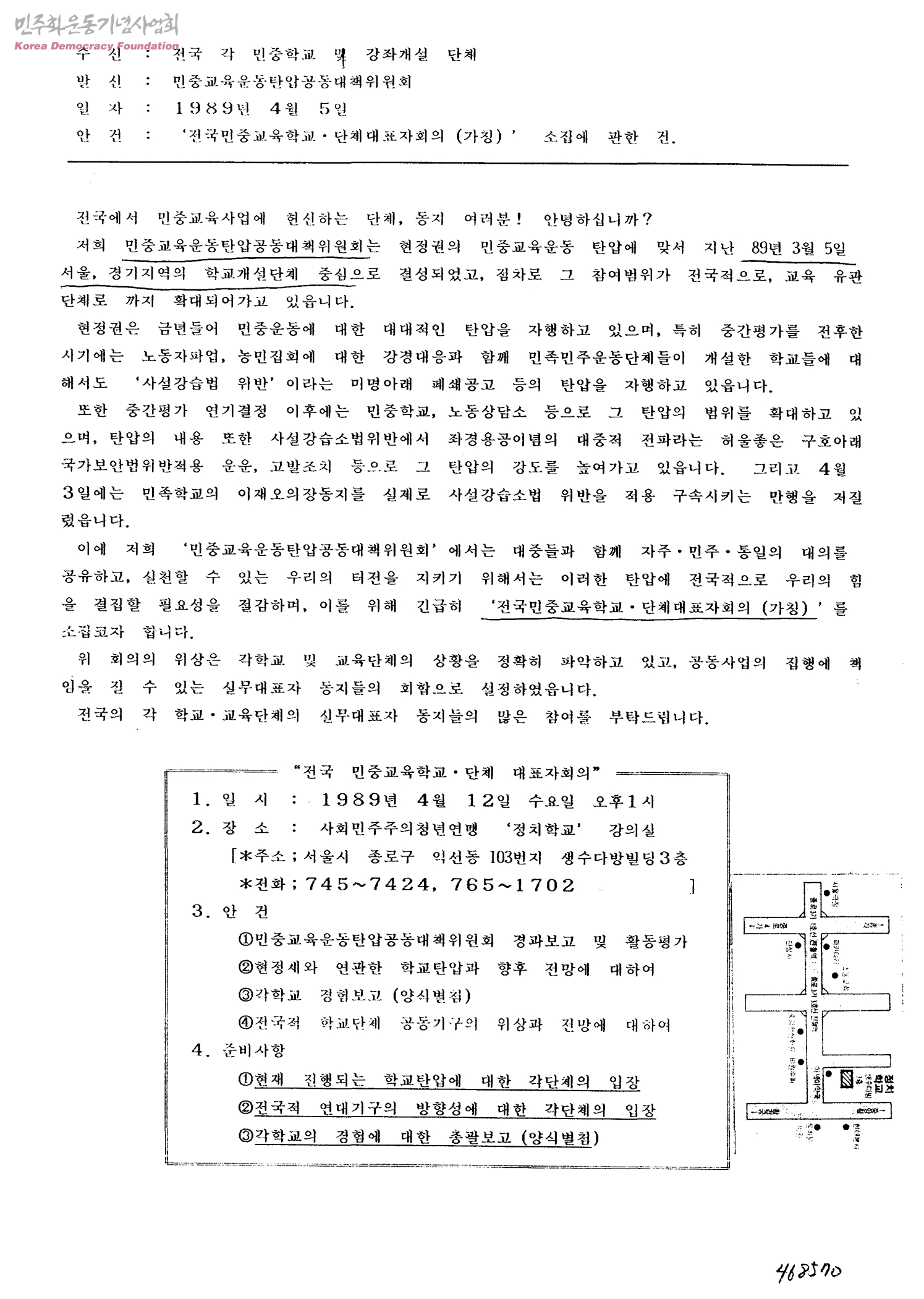 '전국민중교육학교.단체대표자회의(가칭)' 소집에 관한 건[수신:전국 각 민중학교 및 강좌개선 단체, 발신:민중교육운동탄압공동대책위원회]