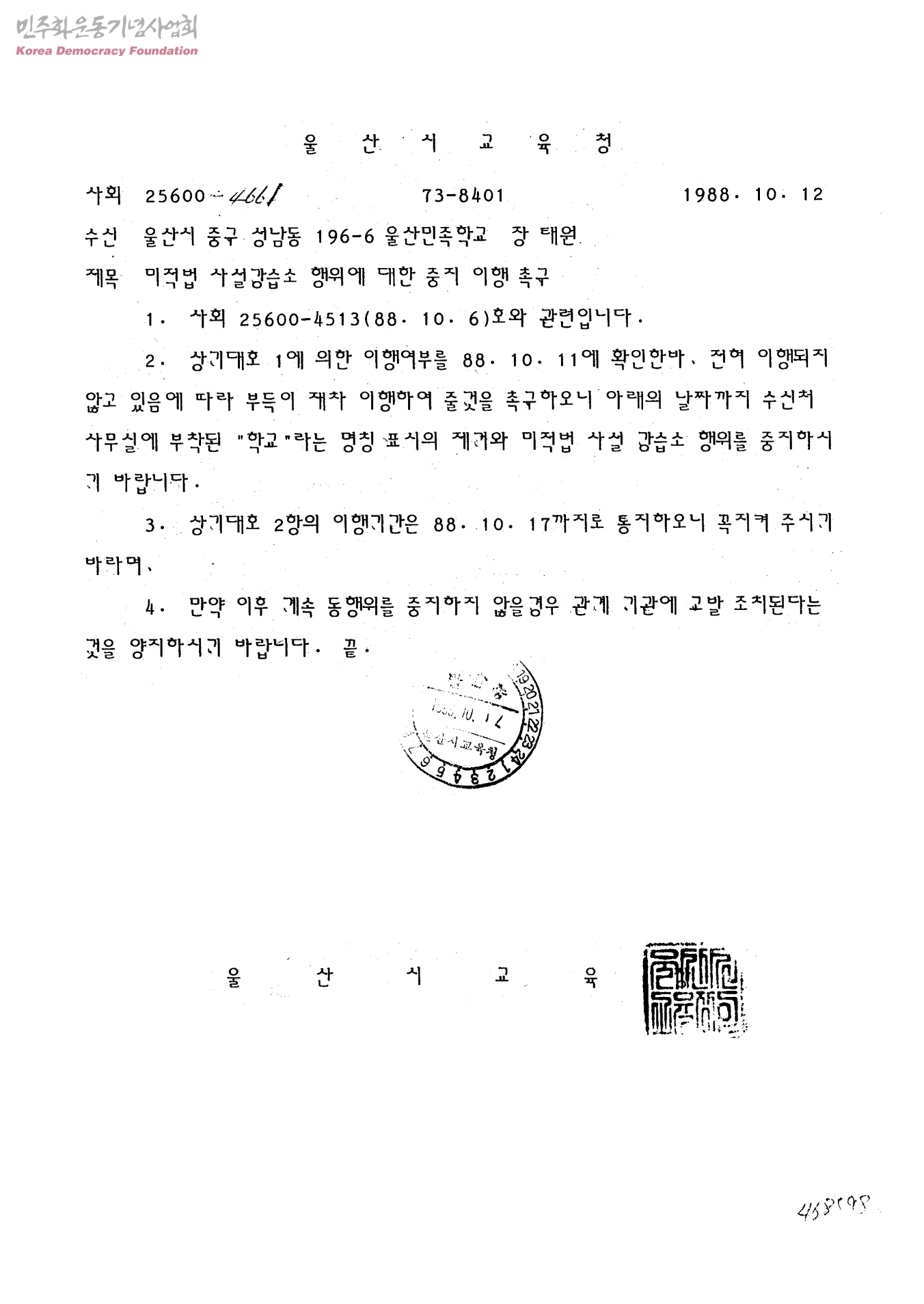 미적법 가설강습소 행위에 대한 중지 이행 촉구[수신:울산민족학교 장태원]