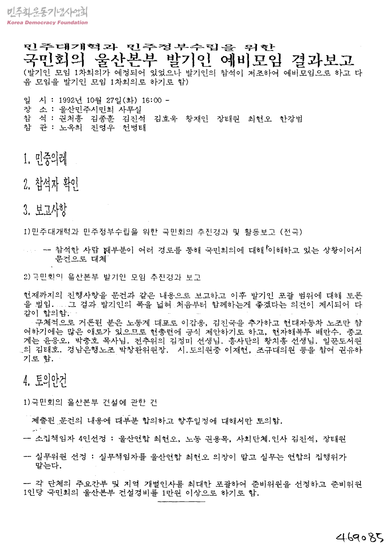 민주대개혁과 민주정부수립을 위한 국민회의 울산본부 발기인 예비모임 결과보고