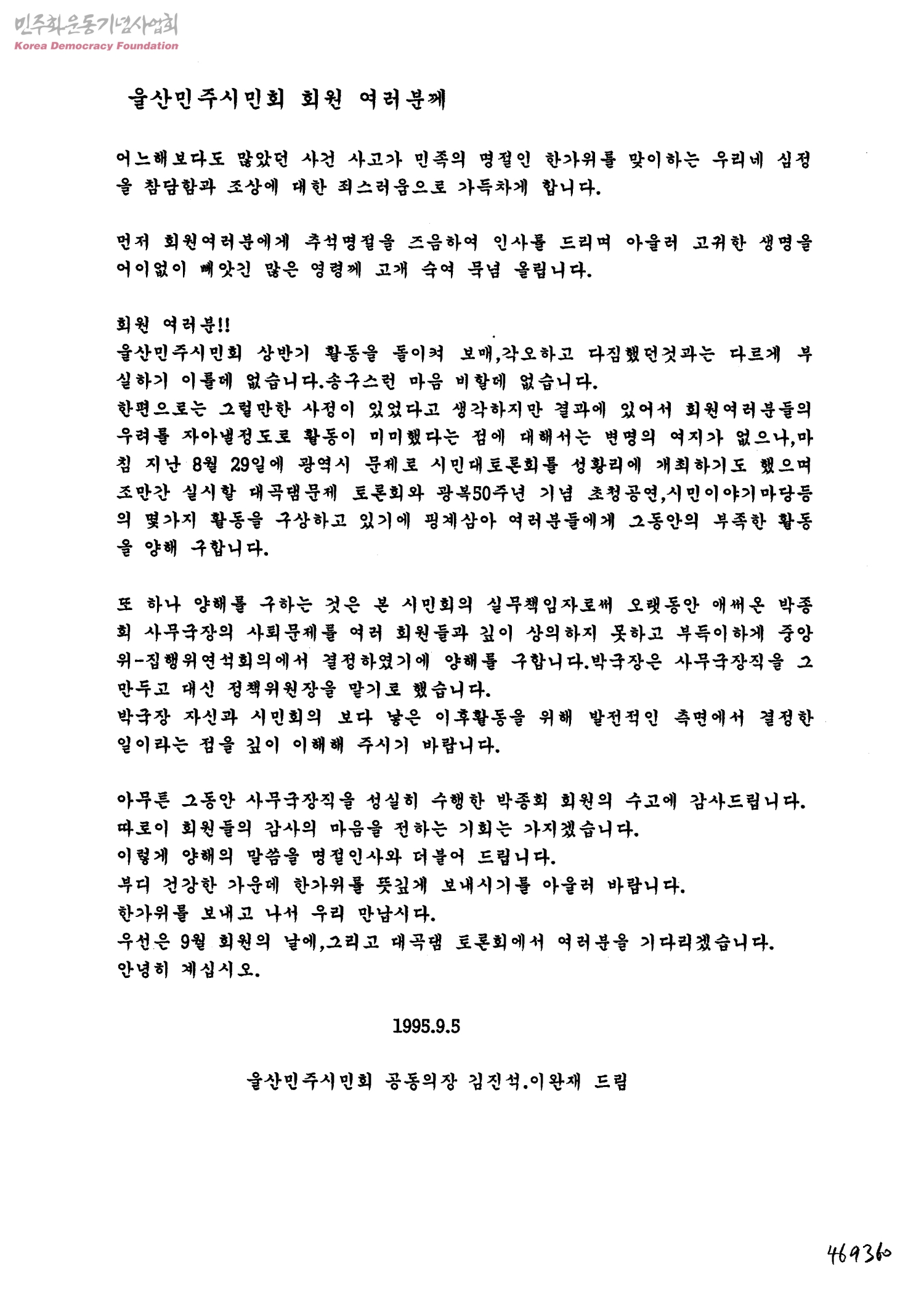 [울산민주시민회 공동의장 김진석,이완재가 울산민주시민회 회원에게 보내는 박종희회원 사퇴에 관한 편지]