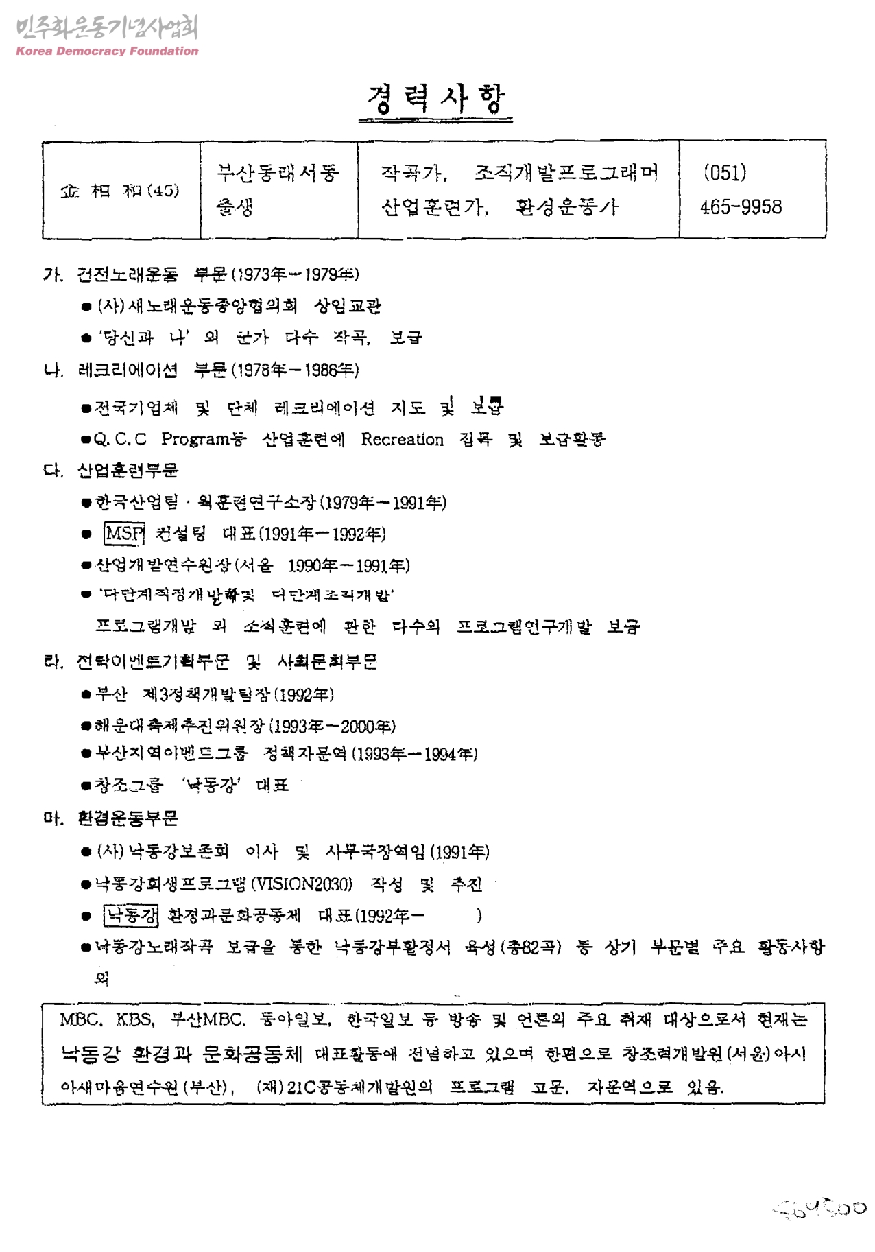 경력사항[낙동강"환경과 문화공동체"대표 金相和 관련]