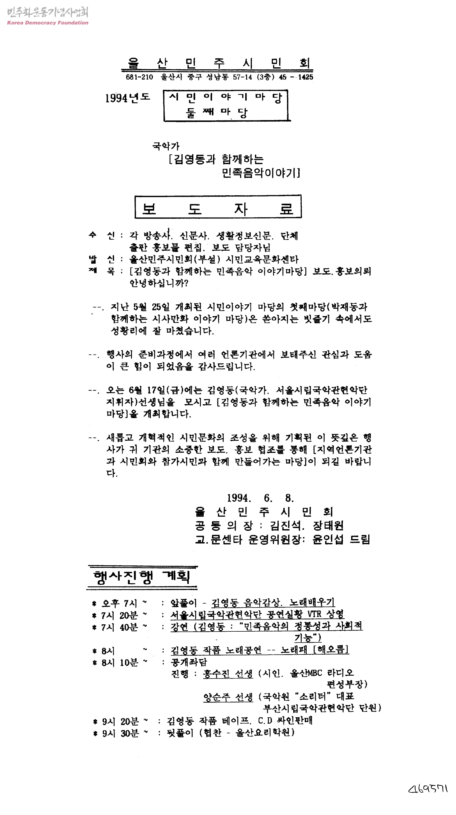 <김영동과 함께하는 민족음악 이야기마당>보도.홍보의뢰[수신:각 방송사, 신문사, 생활정보신문, 단체출판 홍보물 편집, 보도 담당자님, 발신:울산민주시민회(부설)시민교육문화센타]