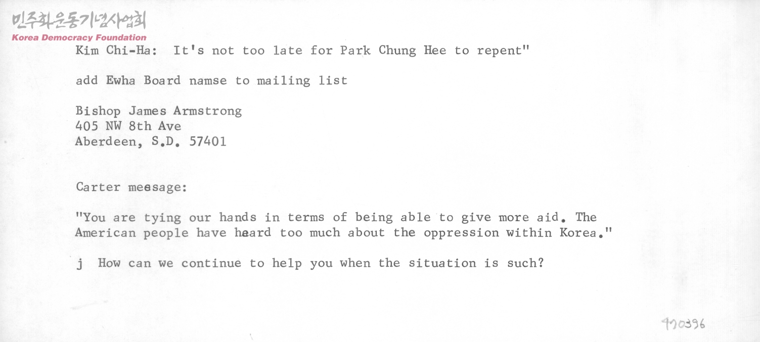 - 김지하:"박정희가 잘못을 깨닫기엔 아직 늦지 않았다." 카터의 메세지:"미국인들은 이미 한국의 상황에 대해 너무 많이 알았는데, 어떻게 당신을 더 도울 수 있겠는가?".