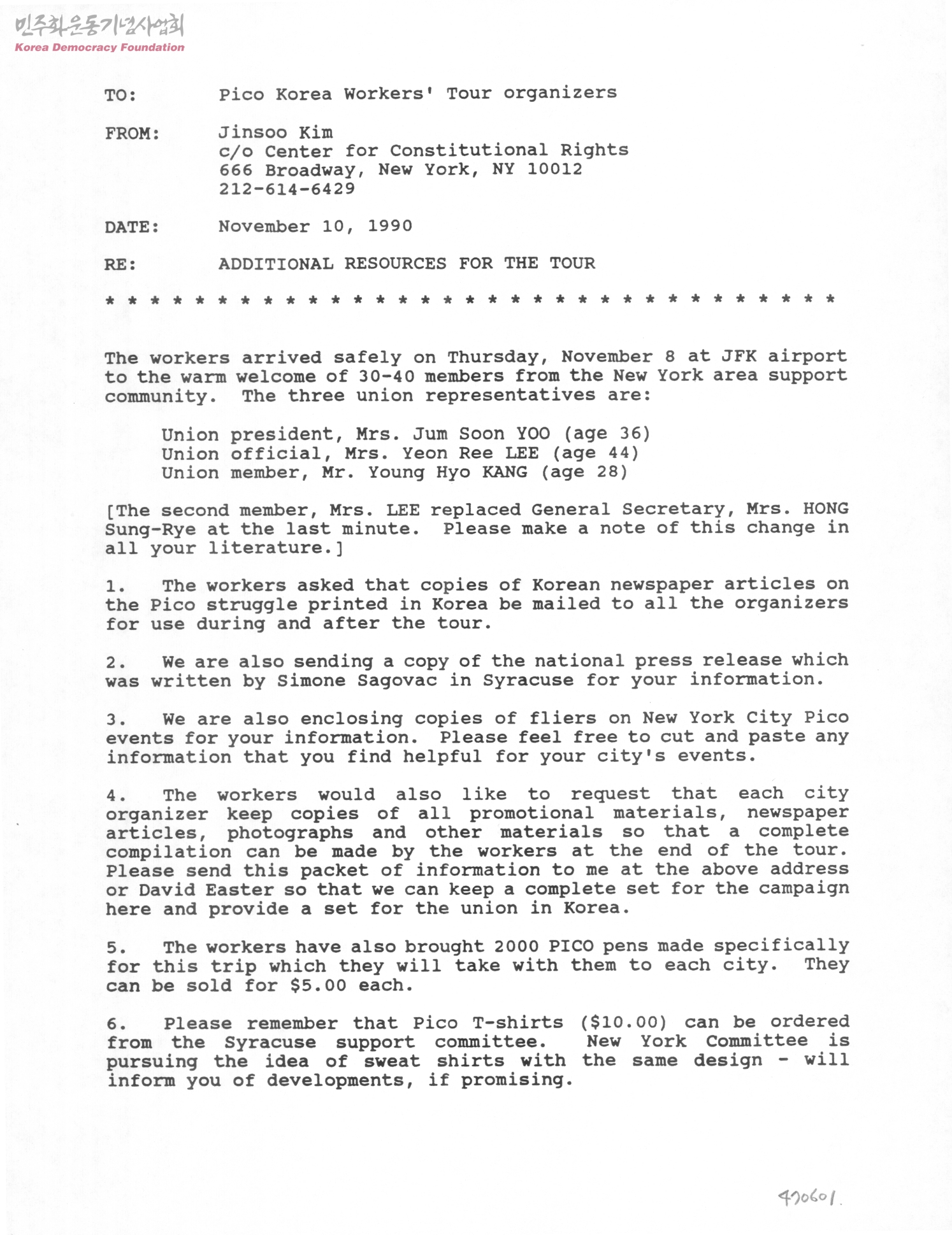 RE: ADDITIONAL RESOURCES FOR THE TOUR[수신:Pico Korea Workers' Tour organizers,발신:Jinsoo Kim]