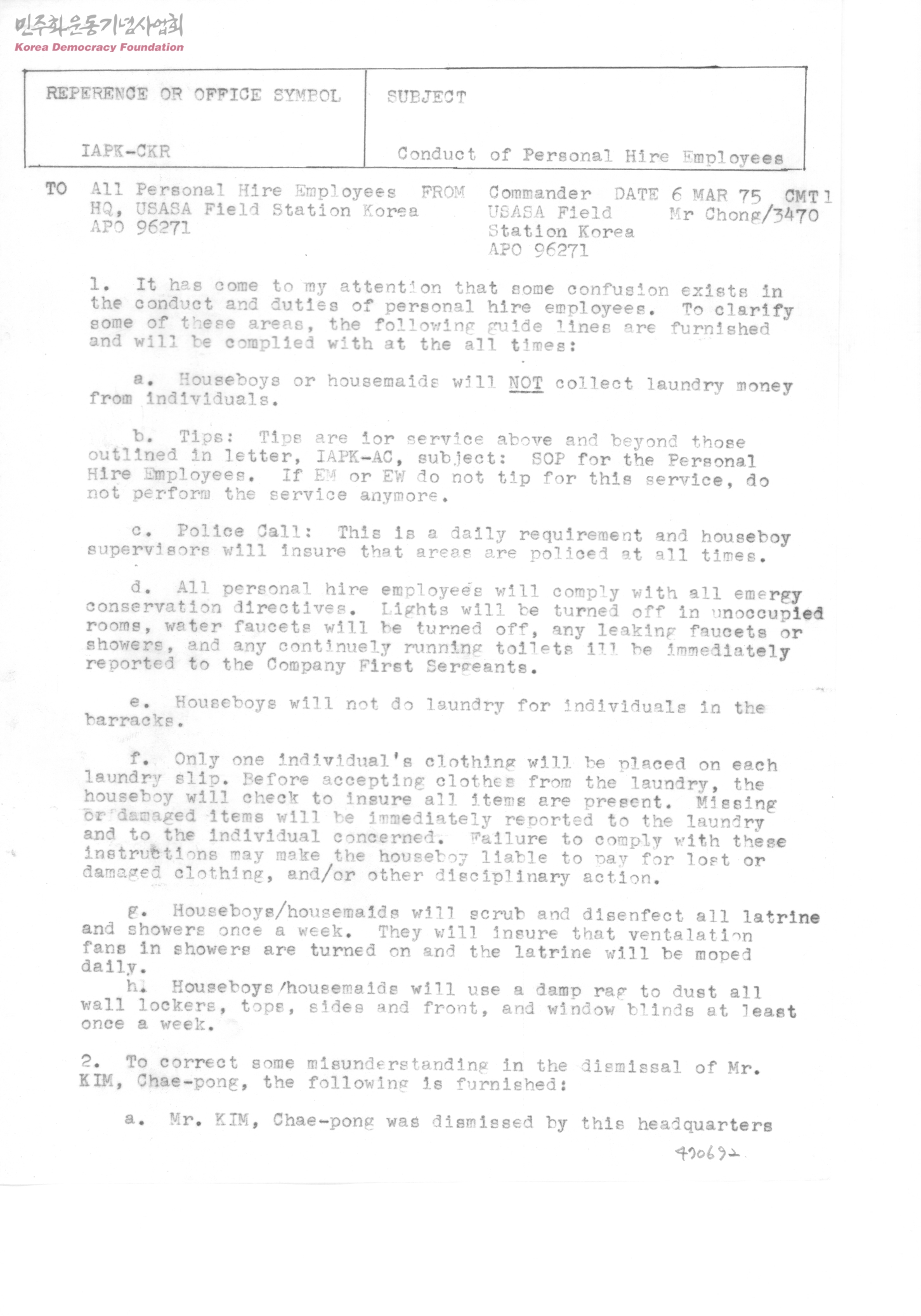 Conduct of Personal Hire Employees[수신:USASA Field Station Korea HQ의 All Personal Hire Employees,발신:USASA Field Station Korea의 Commander]