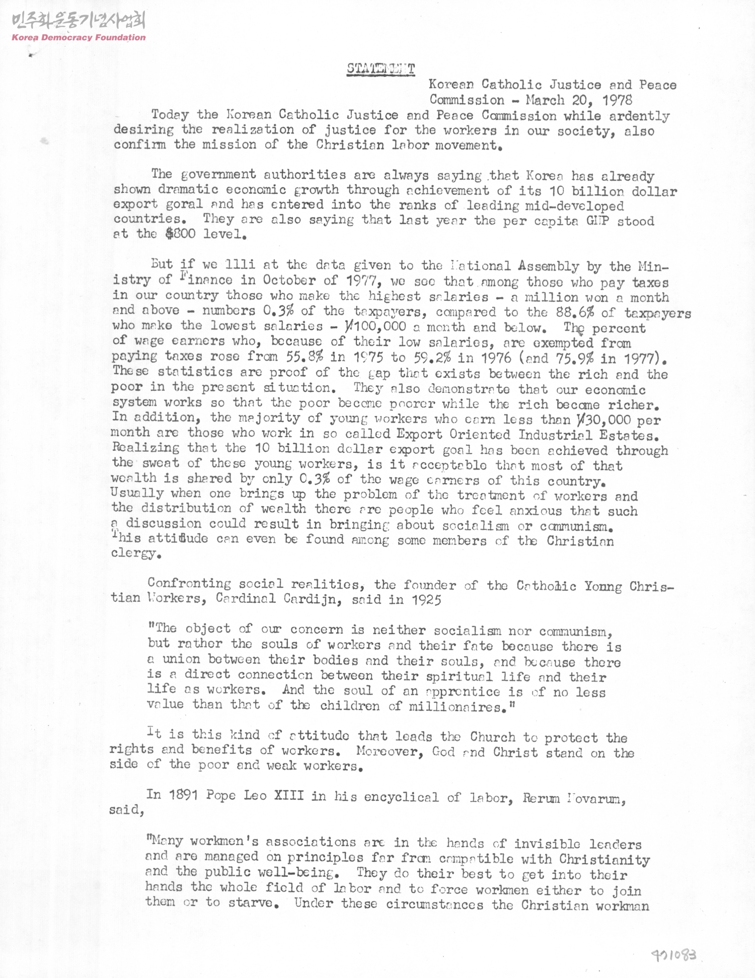 - 한국정부의 노동자(평화시장, 방림방적, 동일방직) 및 노동운동단체(도시산업선교회, 가톨릭노동청년회) 탄압 중단을 요청.